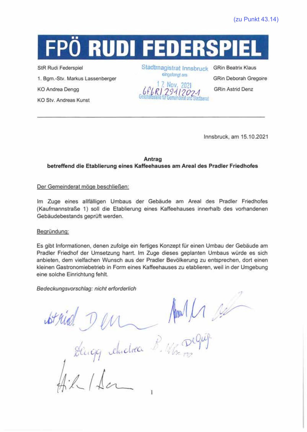 betreffend die Etablierung eines Kaffeehauses am Areal des Pradler Friedhofes
