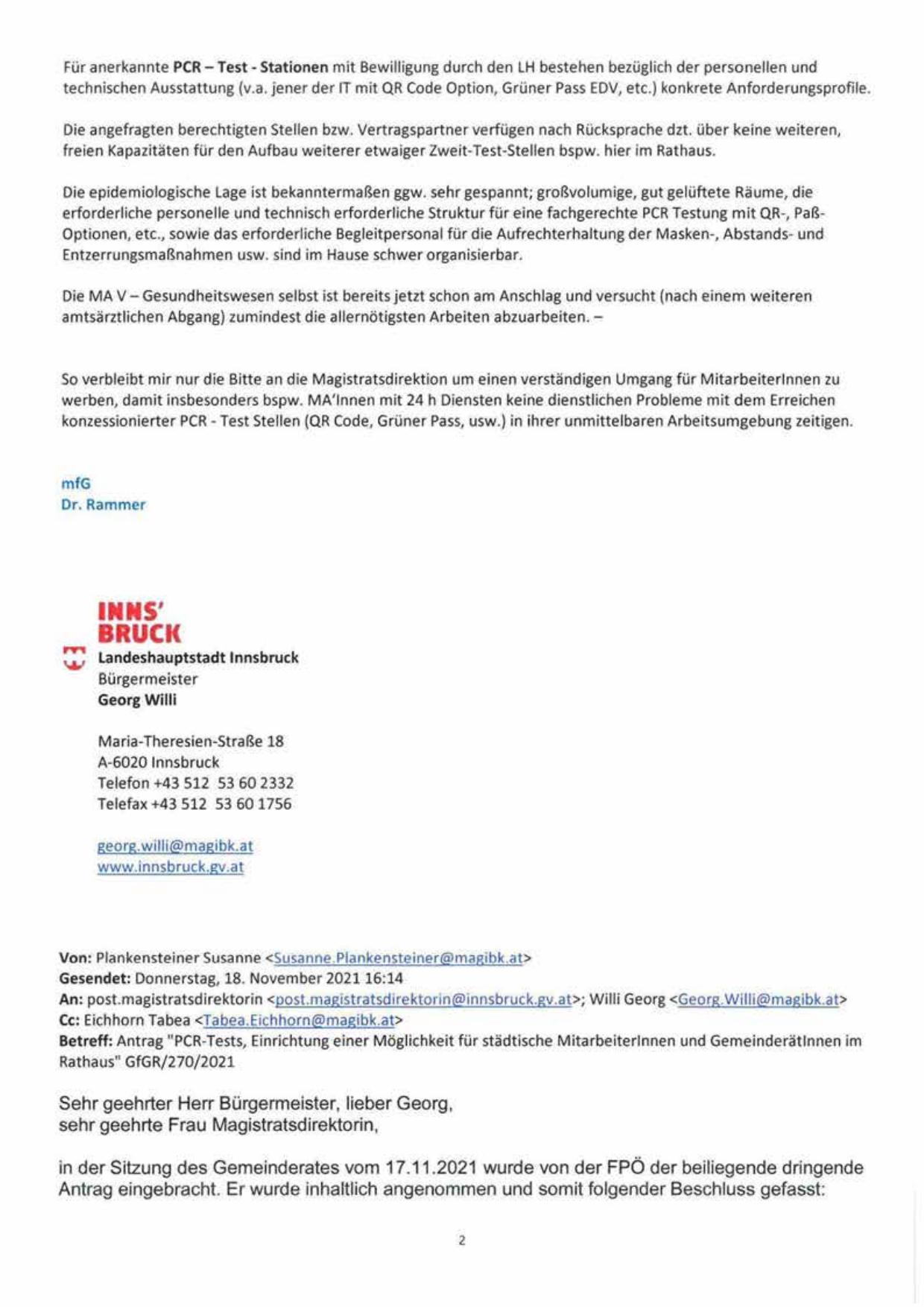 Betreff: Antrag "PCR-Tests, Einrichtung einer Möglichkeit für städtische Mitarbeiterinnen und Gemeinderätinnen im