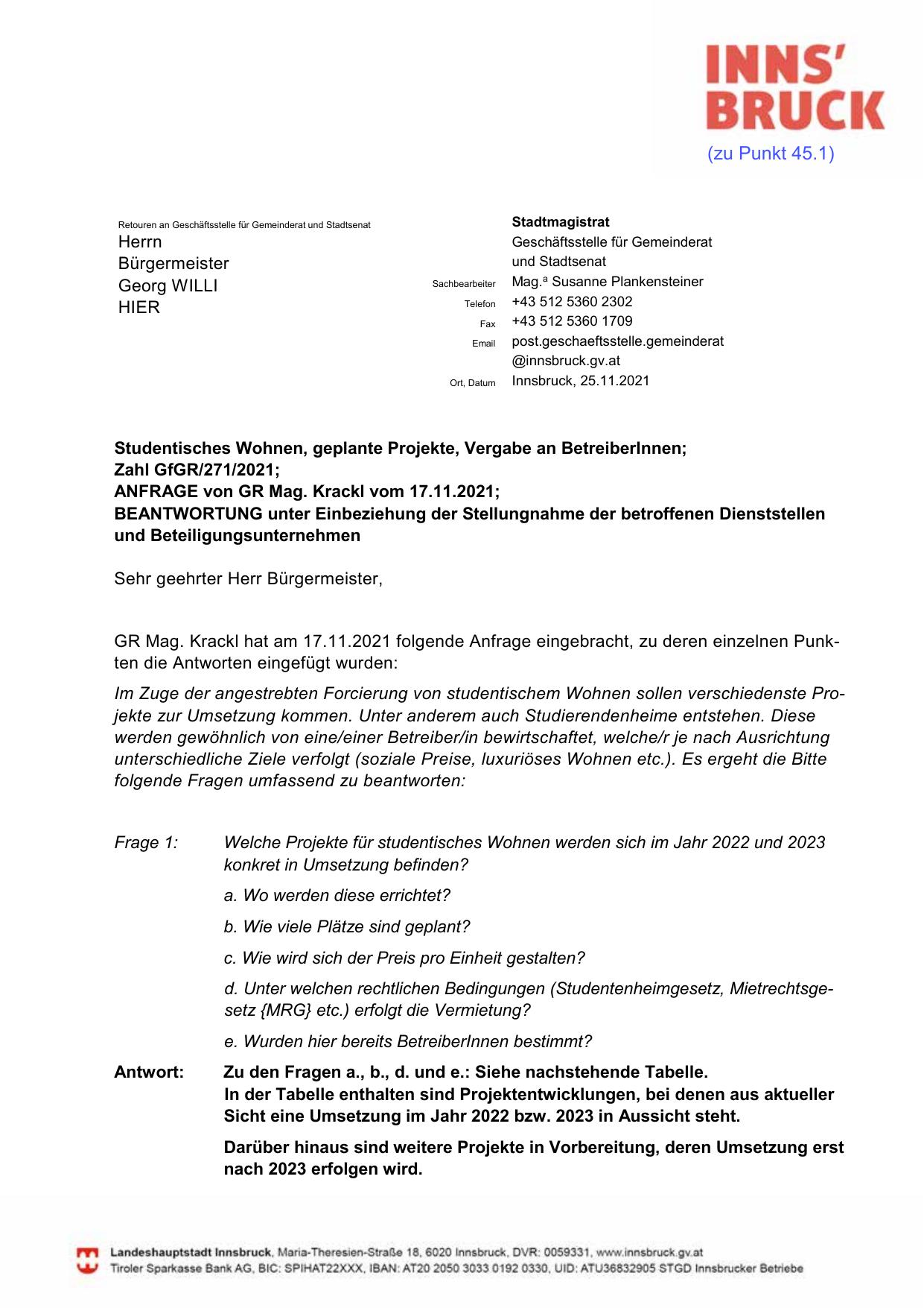 GR Mag. K rackl hat am 17.11.2021 folgende Anfrage eingebracht, zu deren einzelnen Punkten die Antworten eingefügt wurden: