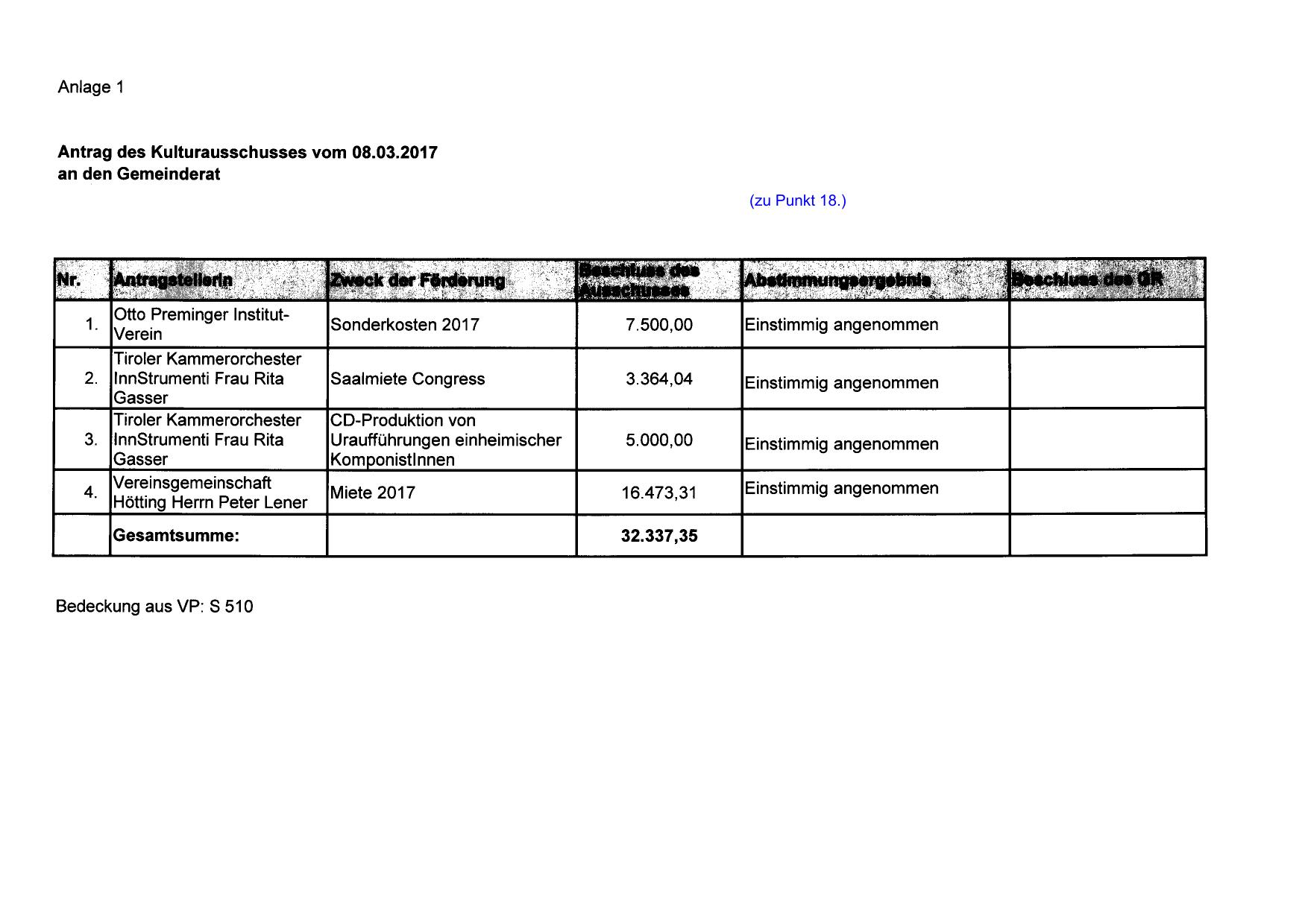 Antrag des Kulturausschusses vom 08.03.2017