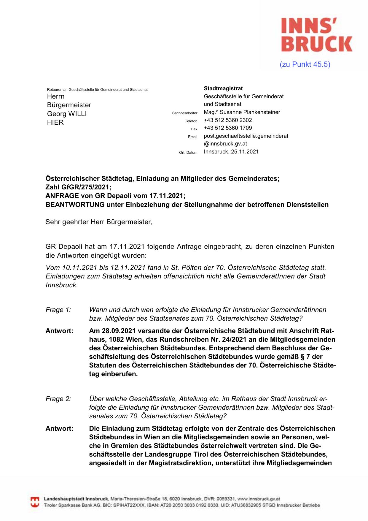 GR Depaoli hat am 17.11.2021 folgende Anfrage eingebracht, zu deren einzelnen Punkten