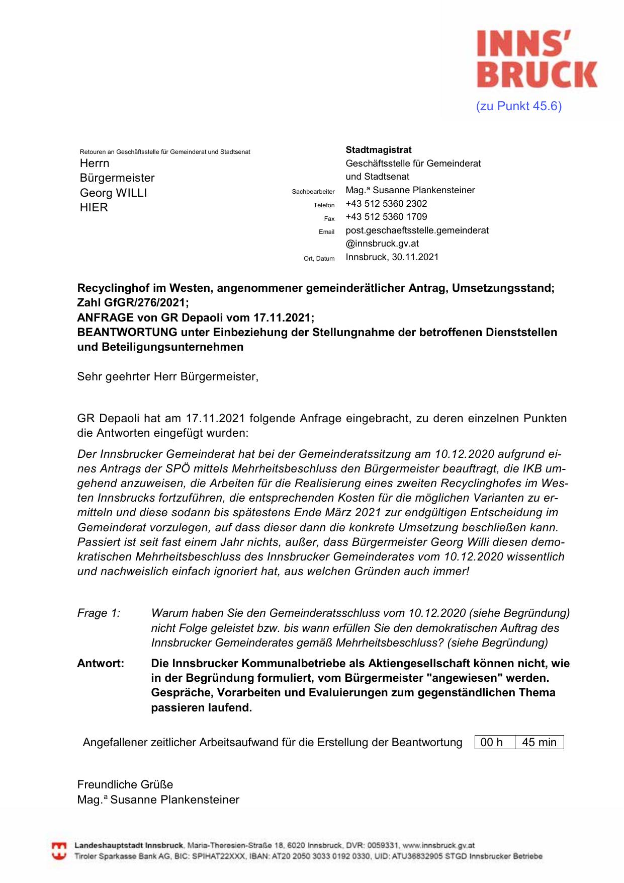 Der Innsbrucker Gemeinderat hat bei der Gemeinderatssitzung am 10.12.2020 aufgrund eines Antrags der SPÖ mittels Mehrheitsbeschluss den Bürgermeister beauftragt, die IK B umgehend anzuweisen, die Arbeiten für die R ealisierung eines zweiten R ecy clinghofes im Westen Innsbrucks fortzuführen, die entsprechenden K osten für die mö glichen Varianten zu ermitteln und diese sodann bis spä testens E nde Mä rz 2021 zur endgültigen E ntscheidung im