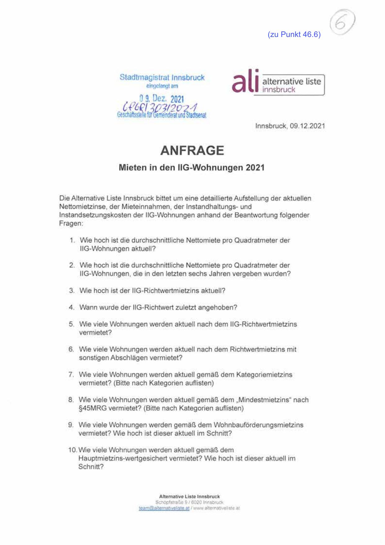 Die Alternative Liste Innsbruck bittet um eine detaillierte Aufstellung der aktuellen