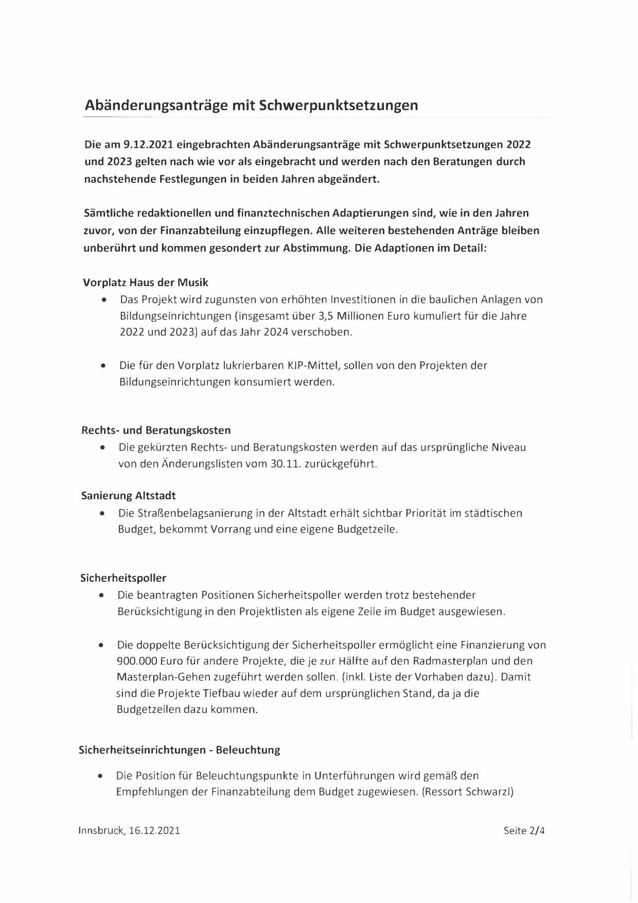 Die am 9.12.2021 eingebrachten Abänderungsanträge mit Schwerpunktsetzungen 2022