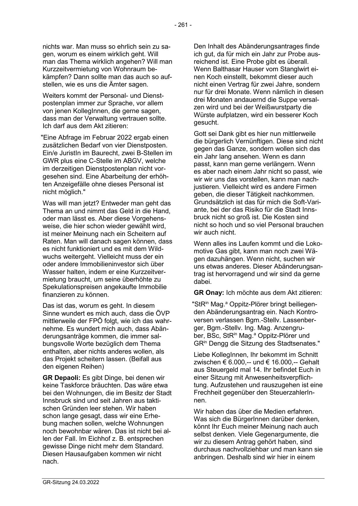 "StRin Mag.a Oppitz-Plörer bringt beiliegenden Abänderungsantrag ein. Nach Kontroversen verlassen Bgm.-Stellv. Lassenberger, Bgm.-Stellv. Ing. Mag. Anzengruber, BSc, StRin Mag.a Oppitz-Plörer und