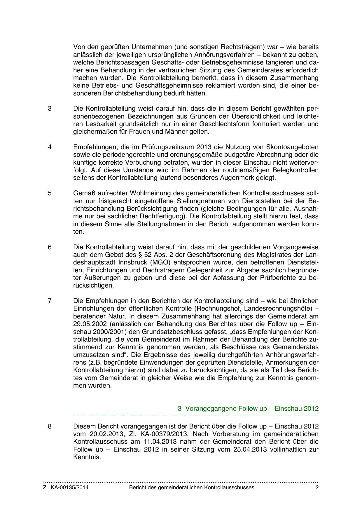 auch dem Gebot des § 52 Abs. 2 der Geschäftsordnung des Magistrates der Landeshauptstadt Innsbruck (MGO) entsprochen wurde, den betroffenen Dienststellen, Einrichtungen und Rechtsträgern Gelegenheit zur Abgabe sachlich begründeter Äußerungen zu geben und diese bei der Abfassung der Prüfberichte zu berücksichtigen.