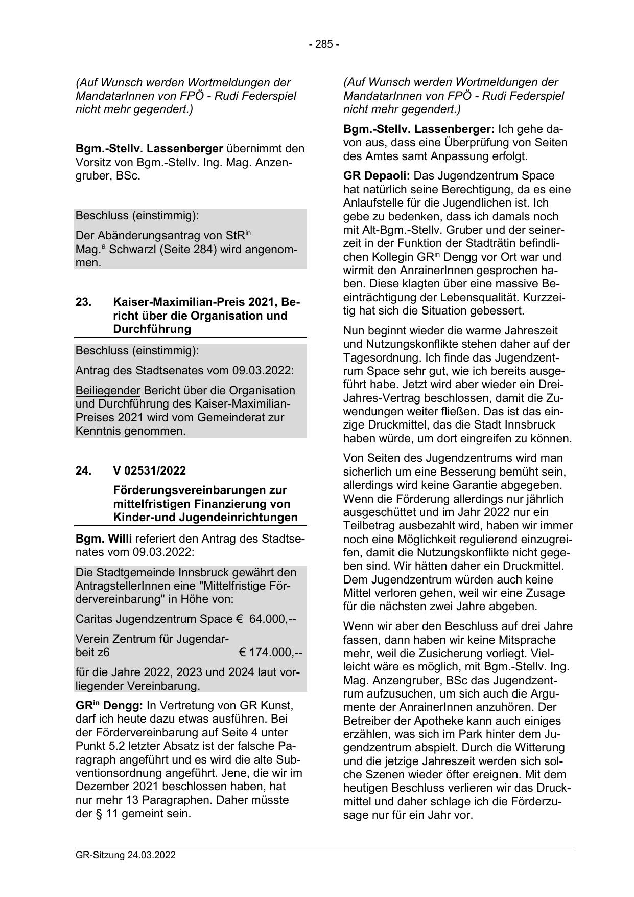 Tagesordnung. Ich finde das Jugendzentrum Space sehr gut, wie ich bereits ausgeführt habe. Jetzt wird aber wieder ein DreiJahres-Vertrag beschlossen, damit die Zuwendungen weiter fließen. Das ist das einzige Druckmittel, das die Stadt Innsbruck