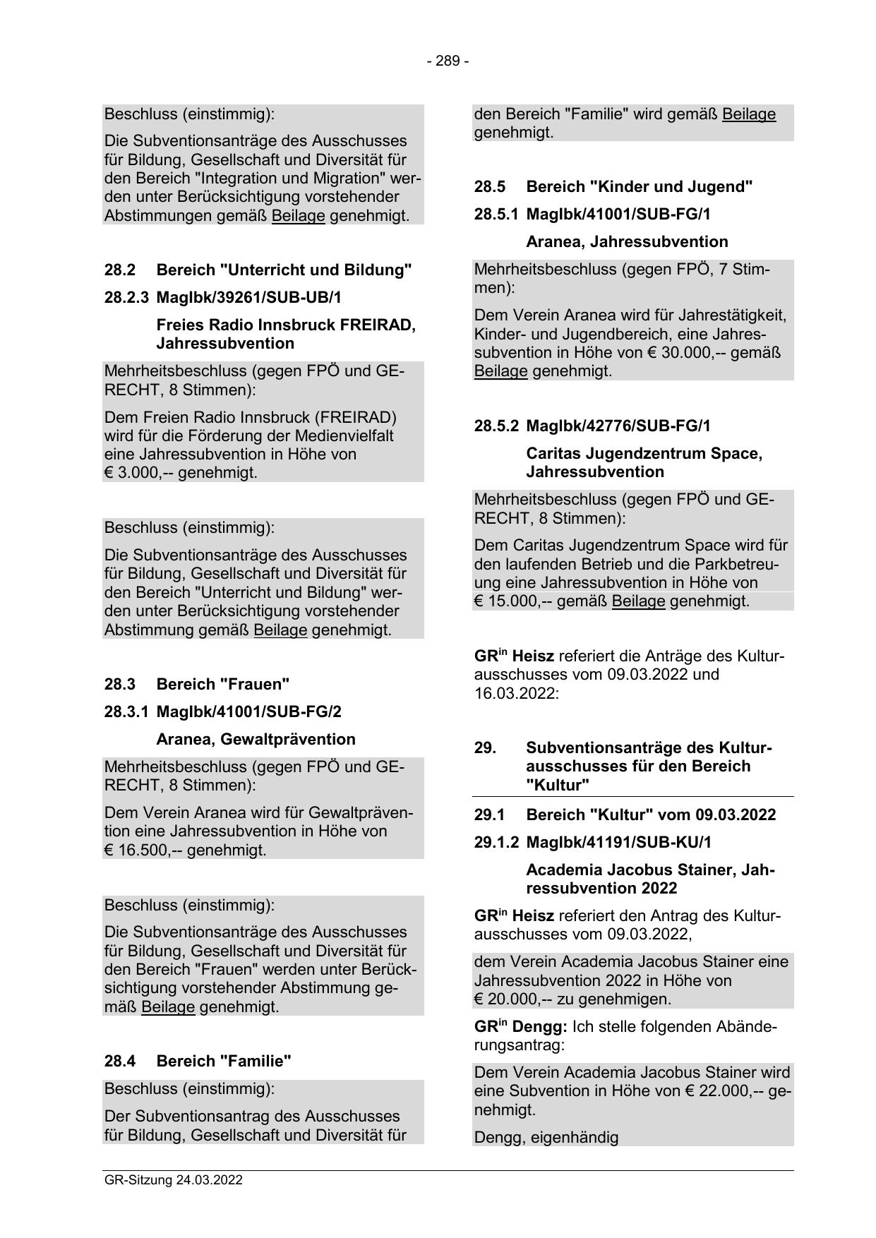 Mehrheitsbeschluss (gegen FPÖ und GERECHT, 8 Stimmen):