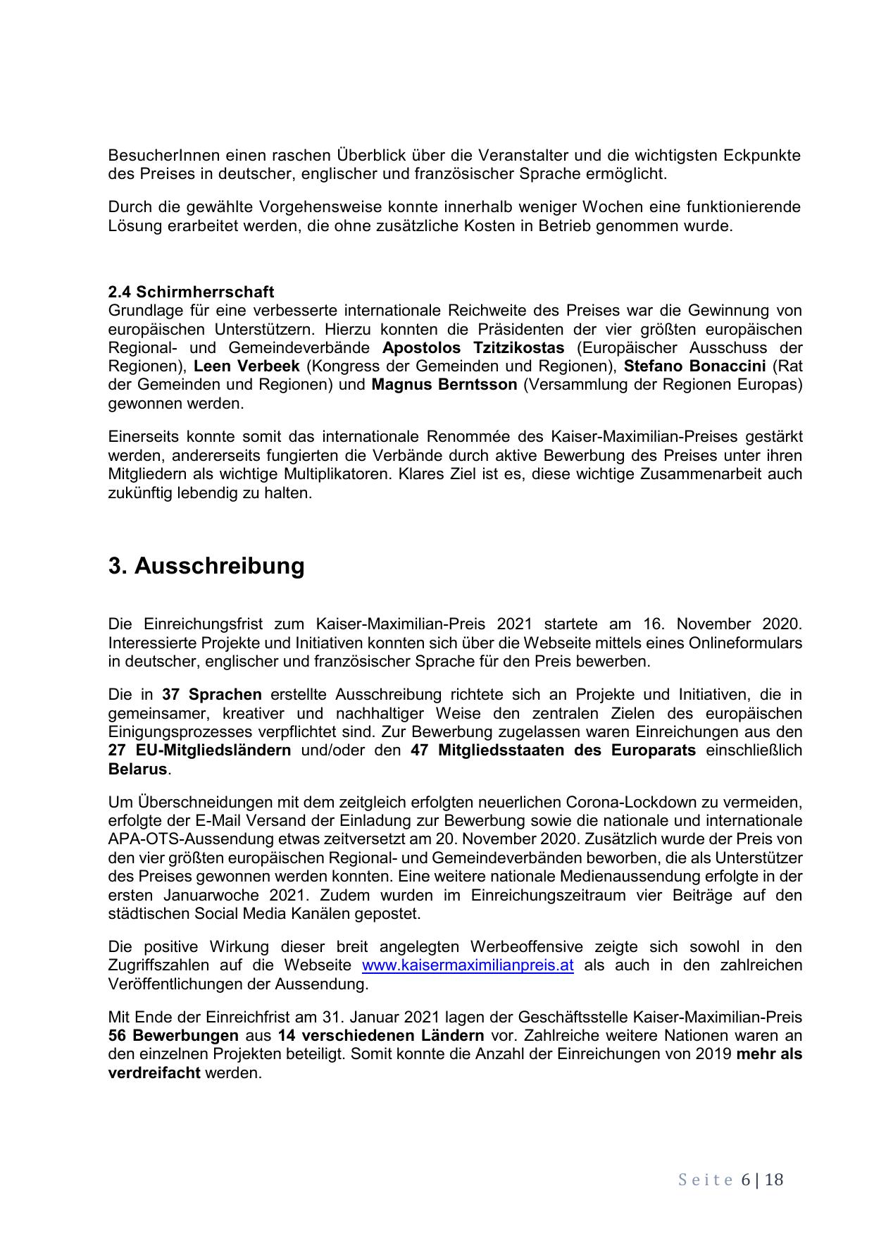 Zugriffszahlen auf die Webseite www.kaisermaximilianpreis.at als auch in den zahlreichen