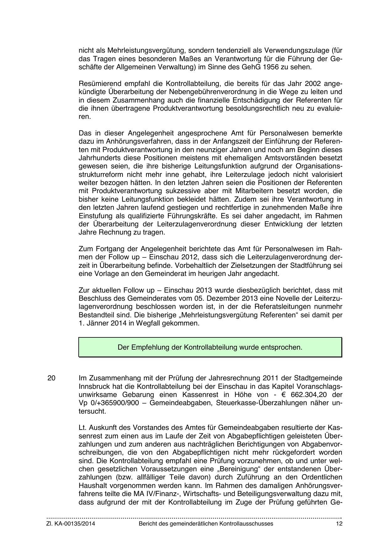 Zum Fortgang der Angelegenheit berichtete das Amt für Personalwesen im Rahmen der Follow up – Einschau 2012, dass sich die Leiterzulagenverordnung derzeit in Überarbeitung befinde. Vorbehaltlich der Zielsetzungen der Stadtführung sei
