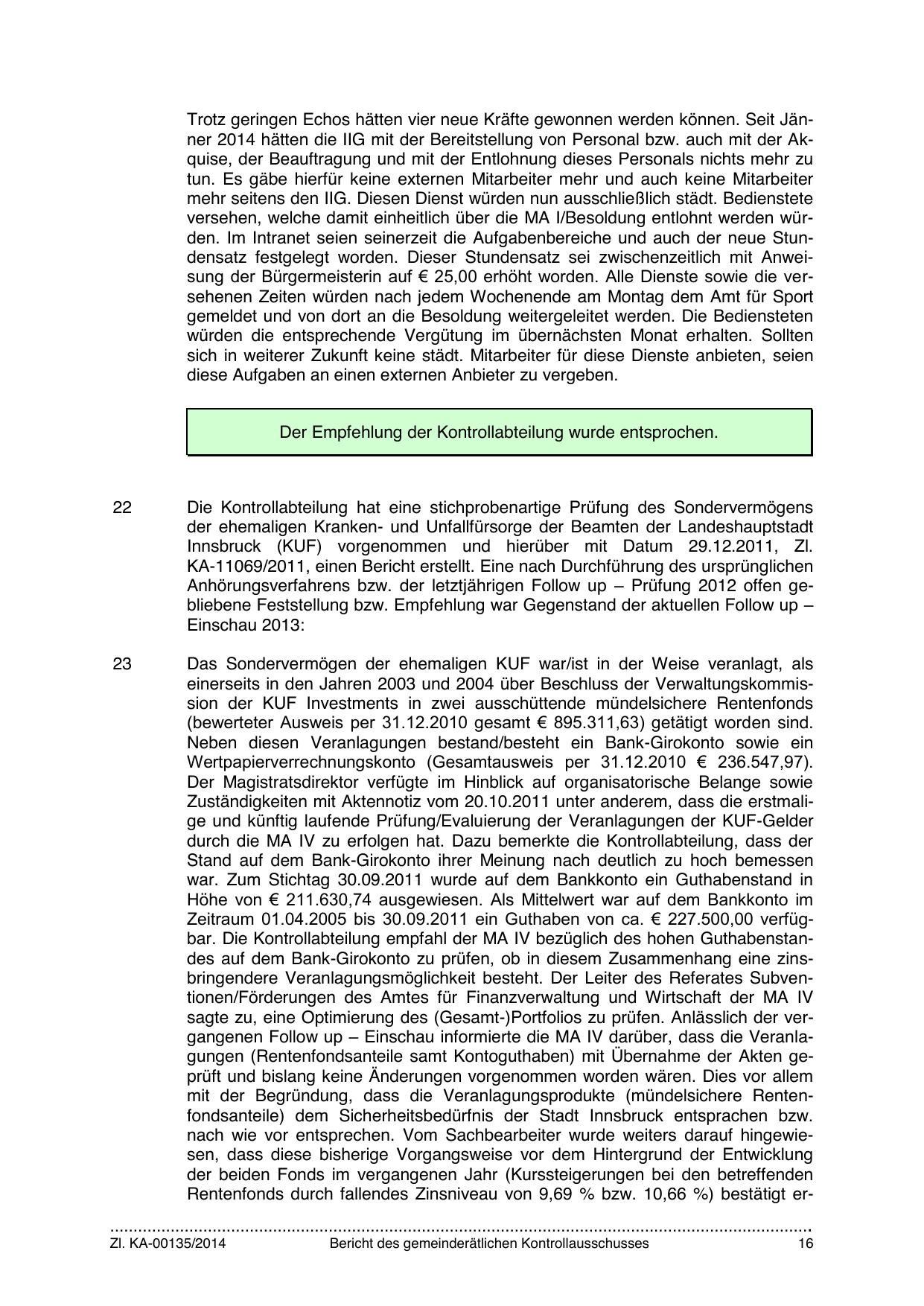 sagte zu, eine Optimierung des (Gesamt-)Portfolios zu prüfen. Anlässlich der vergangenen Follow up – Einschau informierte die MA IV darüber, dass die Veranlagungen (Rentenfondsanteile samt Kontoguthaben) mit Übernahme der Akten geprüft und bislang keine Änderungen vorgenommen worden wären. Dies vor allem