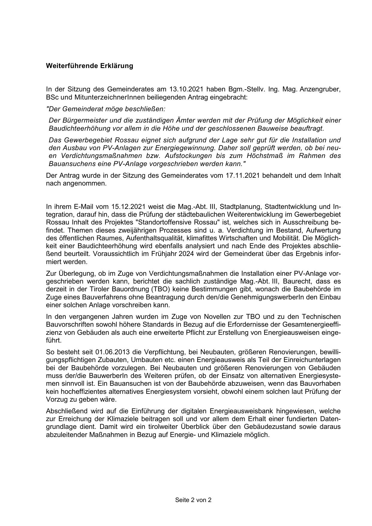 Zur Überlegung, ob im Zuge von Verdichtungsmaßnahmen die Installation einer PV-Anlage vorgeschrieben werden kann, berichtet die sachlich zuständige Mag.-Abt. III, Baurecht, dass es