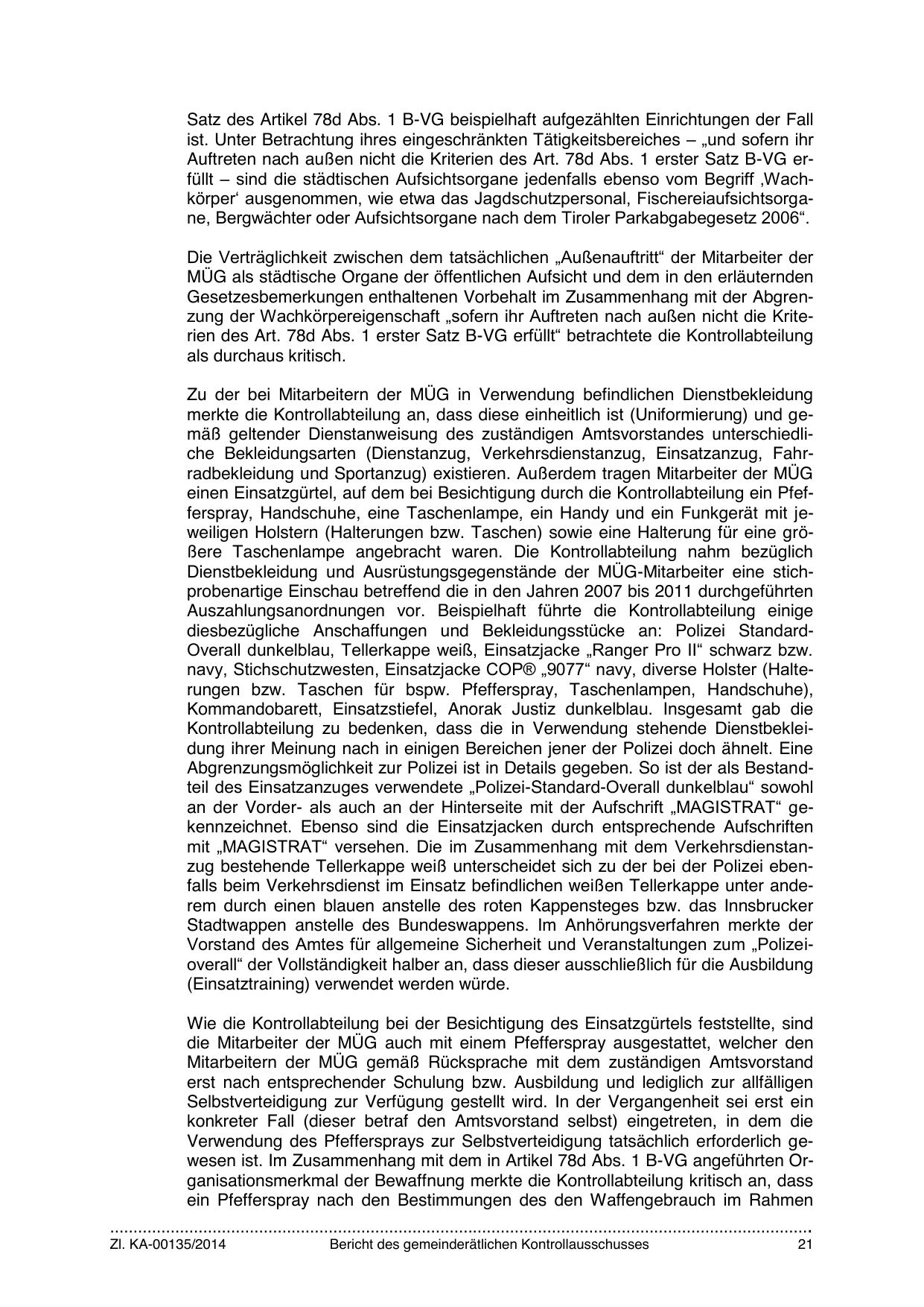 merkte die Kontrollabteilung an, dass diese einheitlich ist (Uniformierung) und gemäß geltender Dienstanweisung des zuständigen Amtsvorstandes unterschiedliche Bekleidungsarten (Dienstanzug, Verkehrsdienstanzug, Einsatzanzug, Fahrradbekleidung und Sportanzug) existieren. Außerdem tragen Mitarbeiter der MÜG