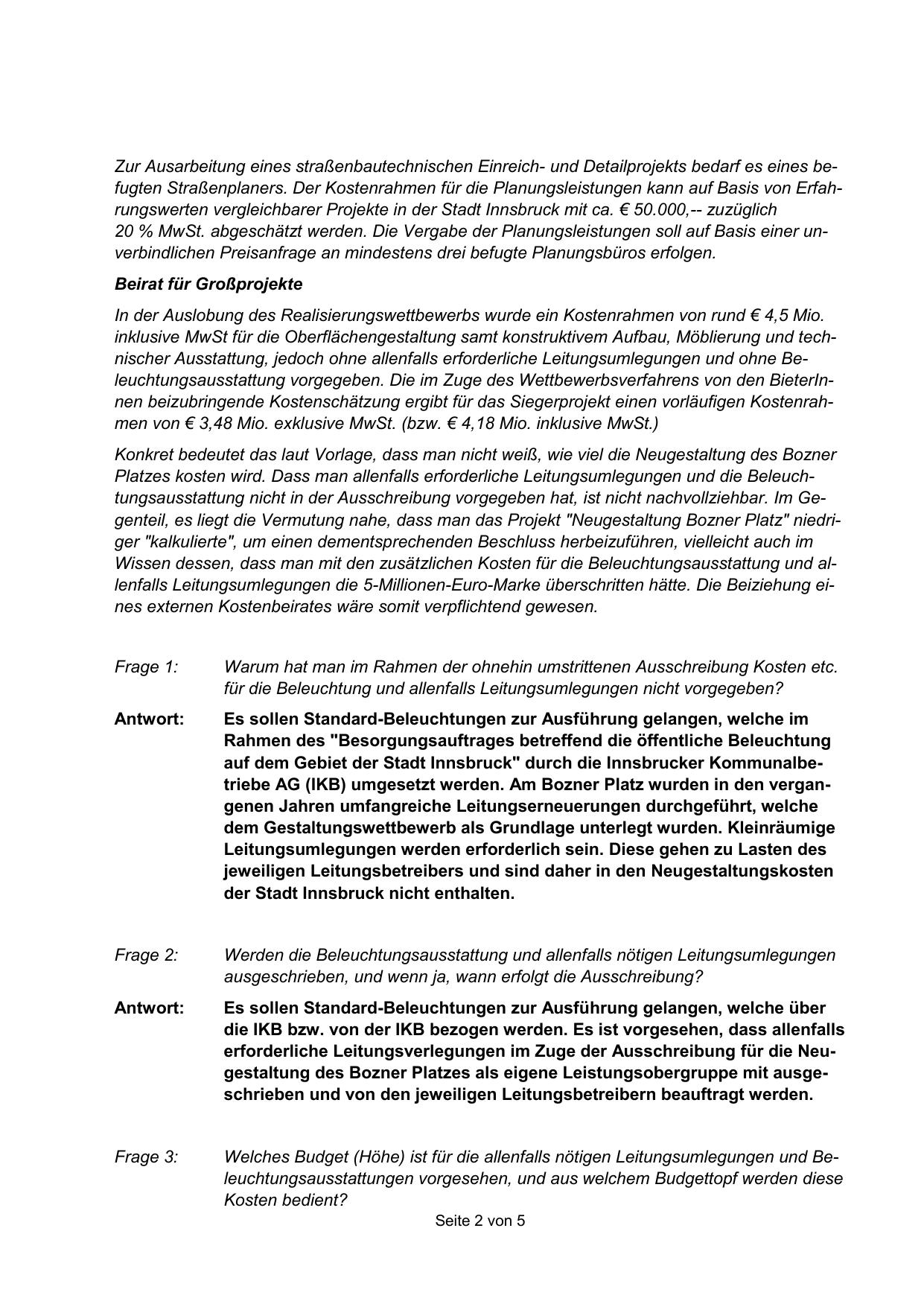 Platzes kosten wird. Dass man allenfalls erforderliche Leitungsumlegungen und die Beleuchtungsausstattung nicht in der Ausschreibung vorgegeben hat, ist nicht nachvollziehbar. Im Gegenteil, es liegt die Vermutung nahe, dass man das Projekt "Neugestaltung Bozner Platz" niedriger "kalkulierte", um einen dementsprechenden Beschluss herbeizuführen, vielleicht auch im