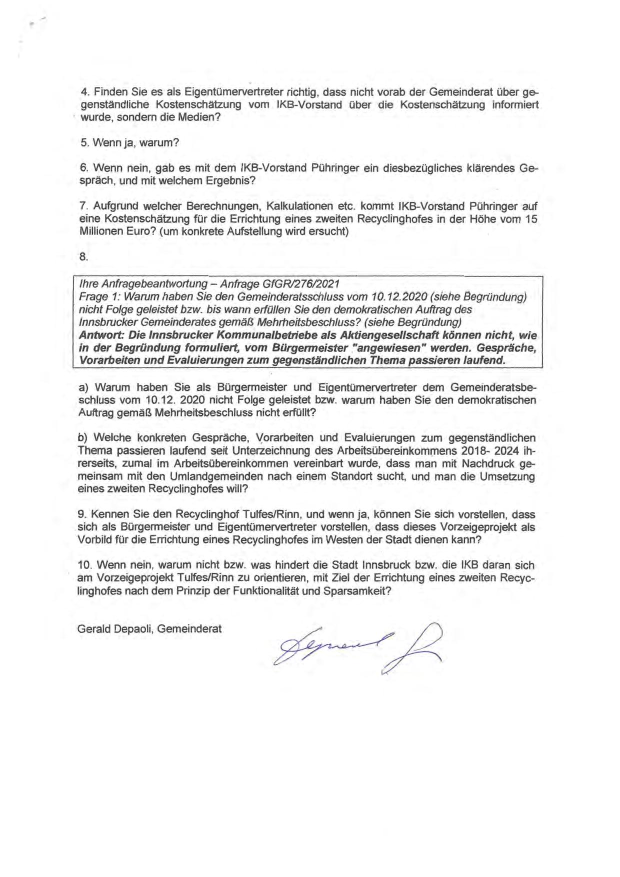 Ihre Anfragebeantwortung - Anfrage GfGR/276/2021