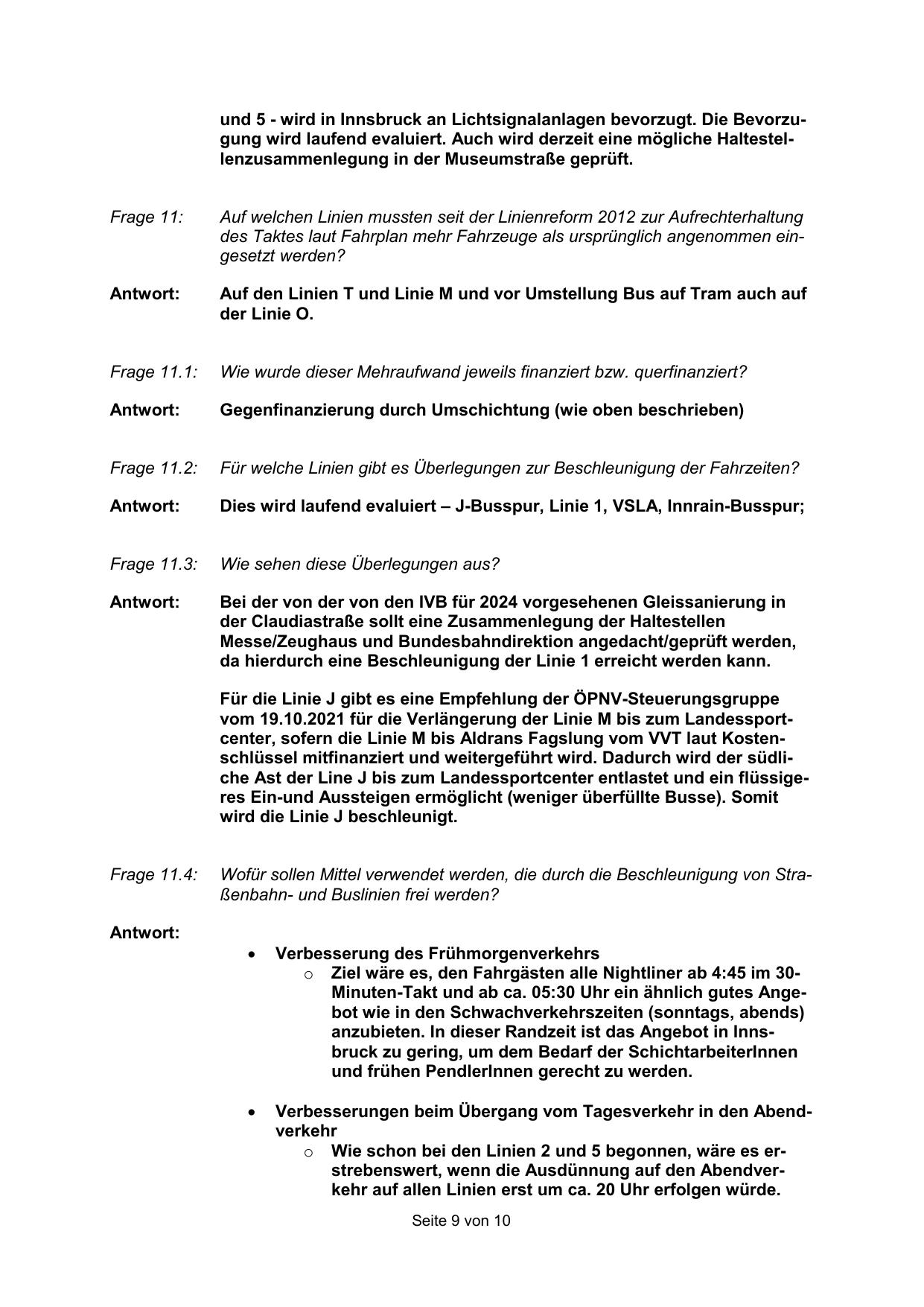 vom 19.10.2021 für die Verlängerung der Linie M bis zum Landessportcenter, sofern die Linie M bis Aldrans Fagslung vom VVT laut Kostenschlüssel mitfinanziert und weitergeführt wird. Dadurch wird der südliche Ast der Line J bis zum Landessportcenter entlastet und ein flüssigeres Ein-und Aussteigen ermöglicht (weniger überfüllte Busse). Somit