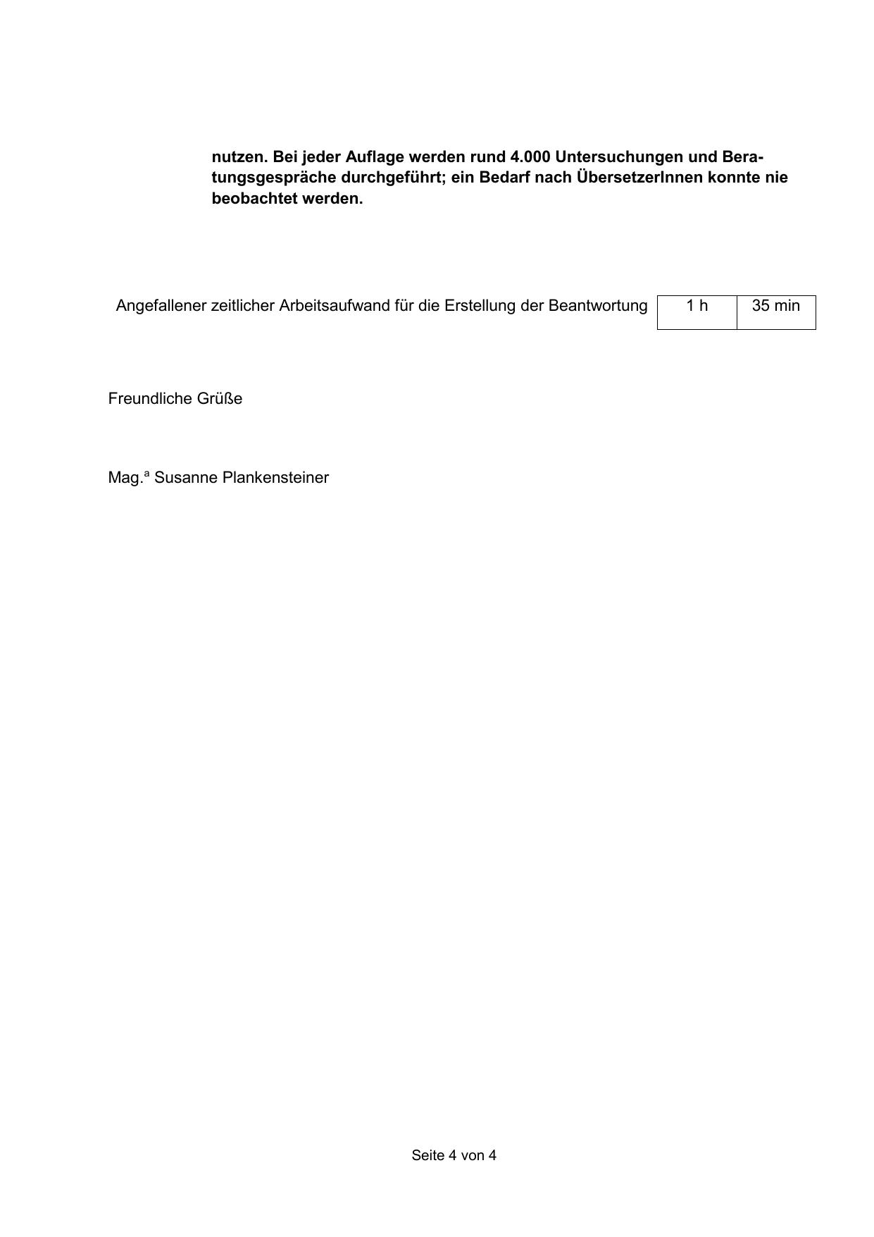 Angefallener zeitlicher Arbeitsaufwand für die Erstellung der Beantwortung