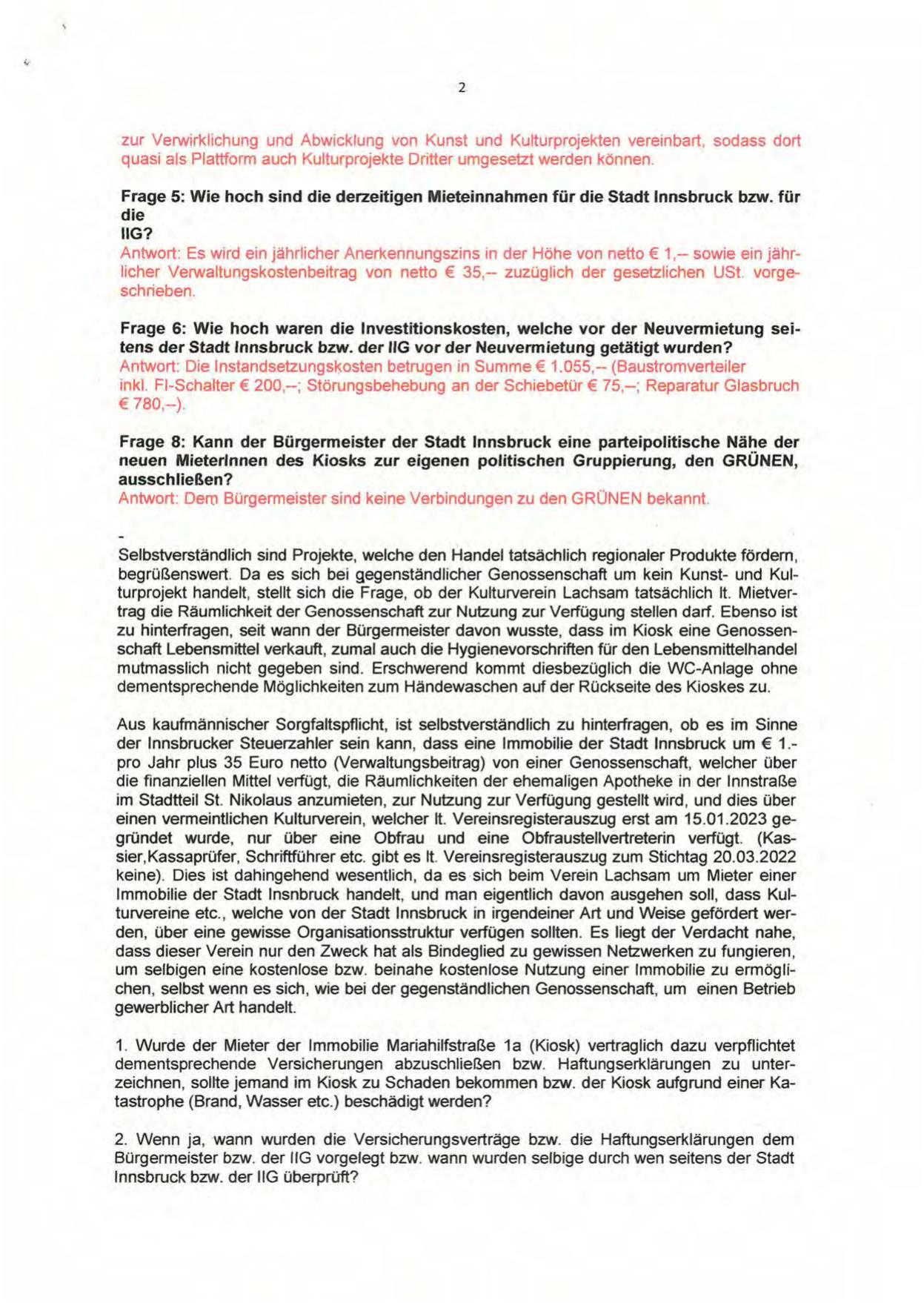 Immobilie der Stadt lnsnbruck handelt, und man eigentlich davon ausgehen soll, dass Kulturvereine etc., welche von der Stadt Innsbruck in irgendeiner Art und Weise gefördert werden, über eine gewisse Organisationsstruktur verfügen sollten. Es liegt der Verdacht nahe,