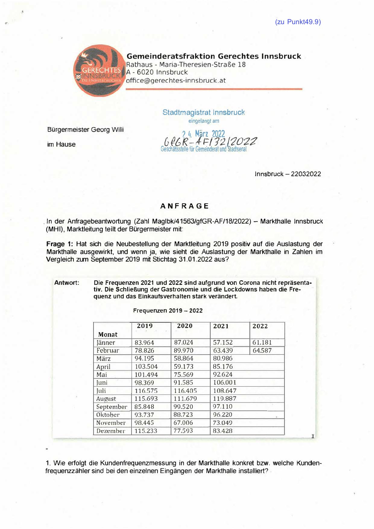 . In der Anfragebeantwortung (Zahl Maglbk/41563/gfGR-AF/18/2022) - Markthalle Innsbruck