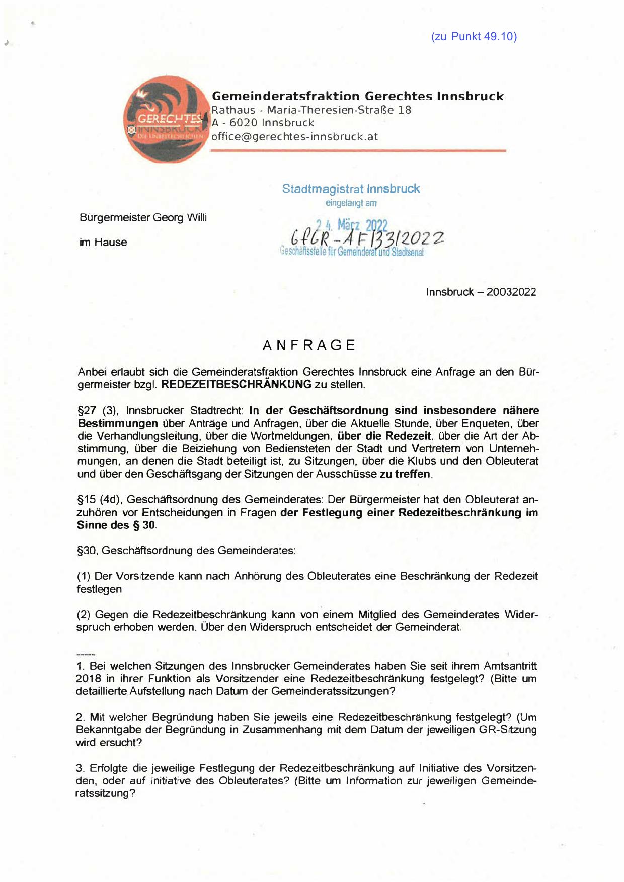 Anbei erlaubt sich die Gemeinderatsfraktion Gerechtes Innsbruck eine Anfrage an den Bür