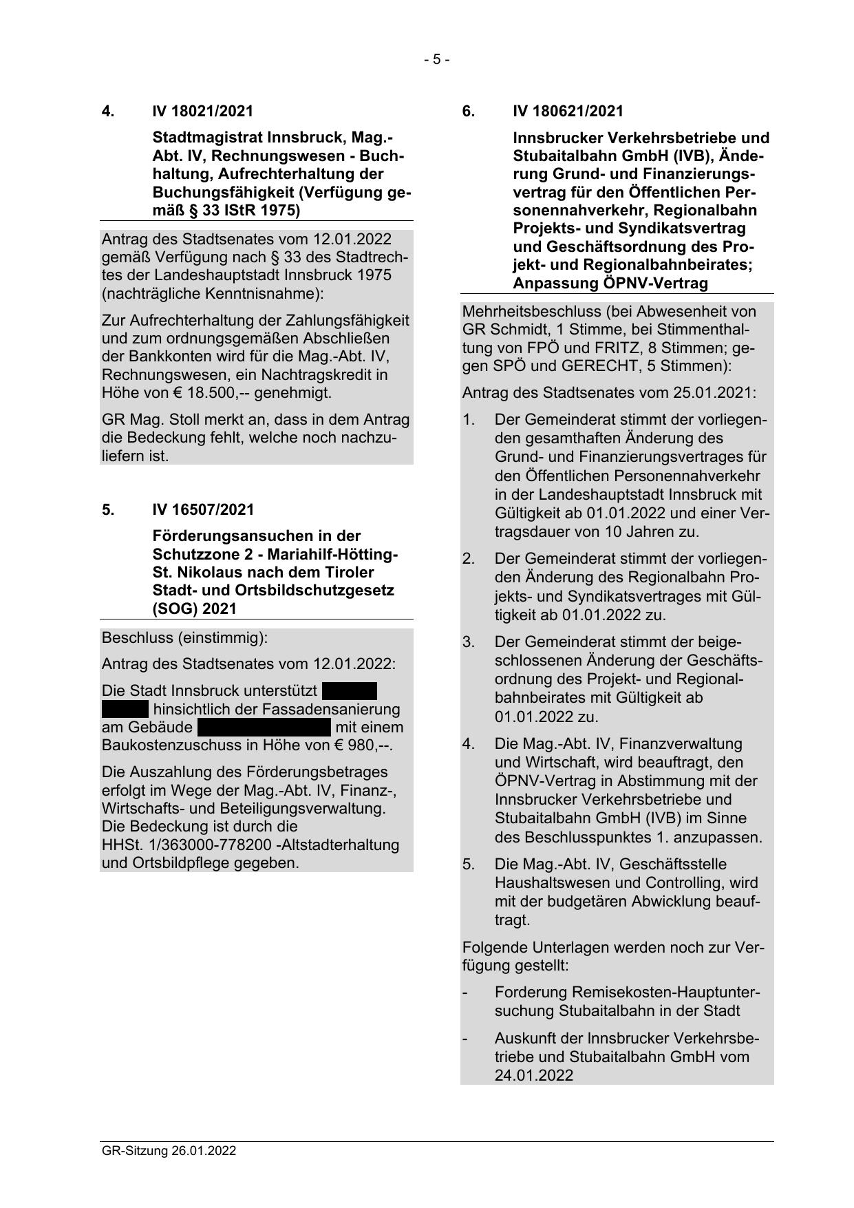 GR Schmidt, 1 Stimme, bei Stimmenthaltung von FPÖ und FRITZ, 8 Stimmen; gegen SPÖ und GERECHT, 5 Stimmen):