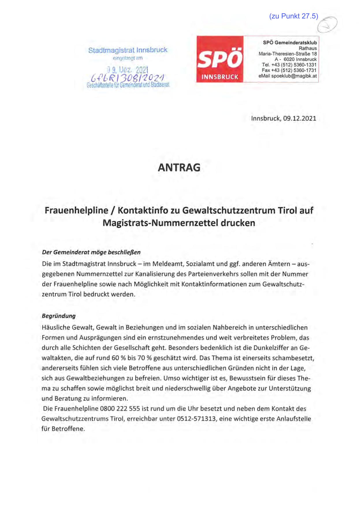 Die im Stadtmagistrat Innsbruck - im Meldeamt, Sozialamt und ggf. anderen Ämtern - ausgegebenen Nummernzettel zur Kanalisierung des Parteienverkehrs sollen mit der Nummer