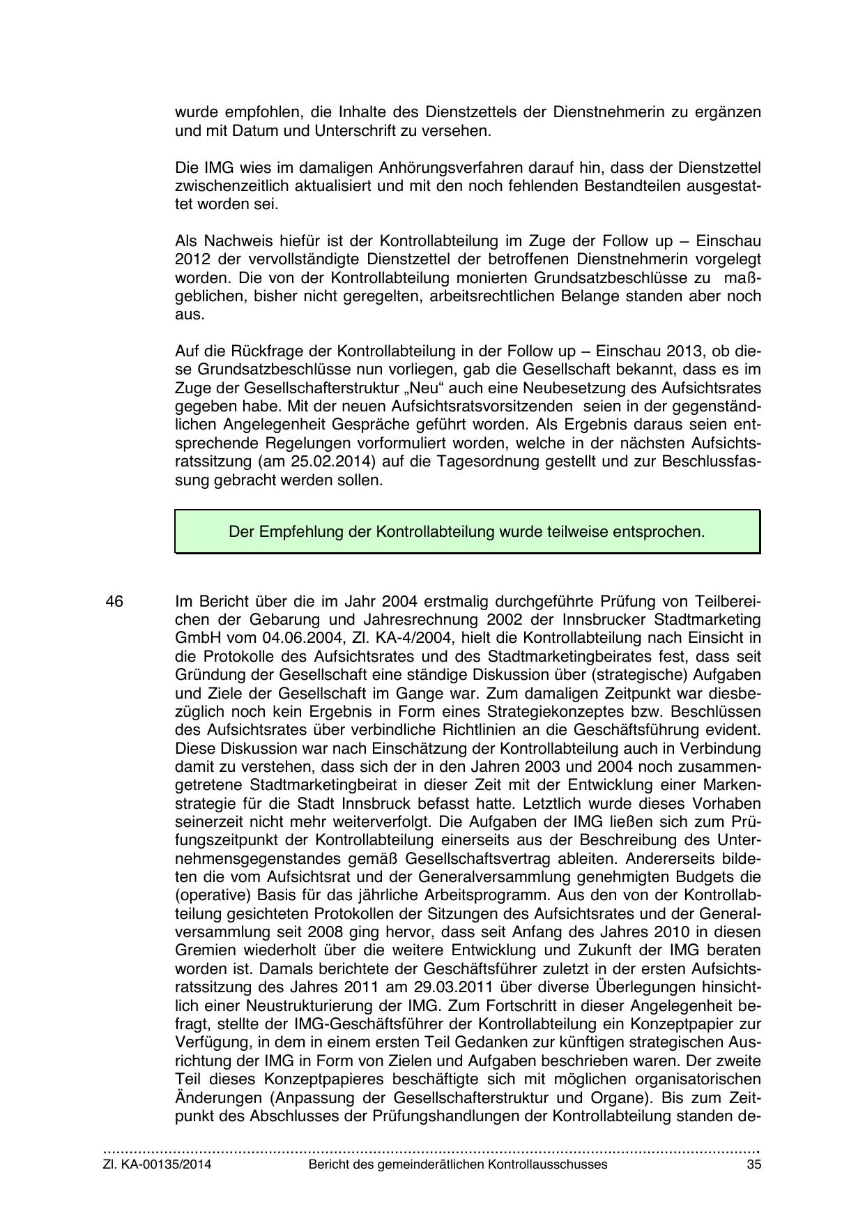 Auf die Rückfrage der Kontrollabteilung in der Follow up – Einschau 2013, ob diese Grundsatzbeschlüsse nun vorliegen, gab die Gesellschaft bekannt, dass es im