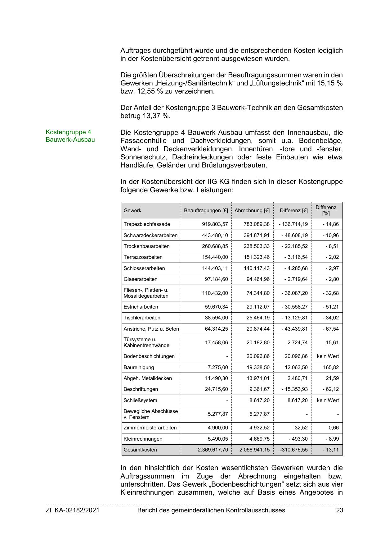 In den hinsichtlich der Kosten wesentlichsten Gewerken wurden die