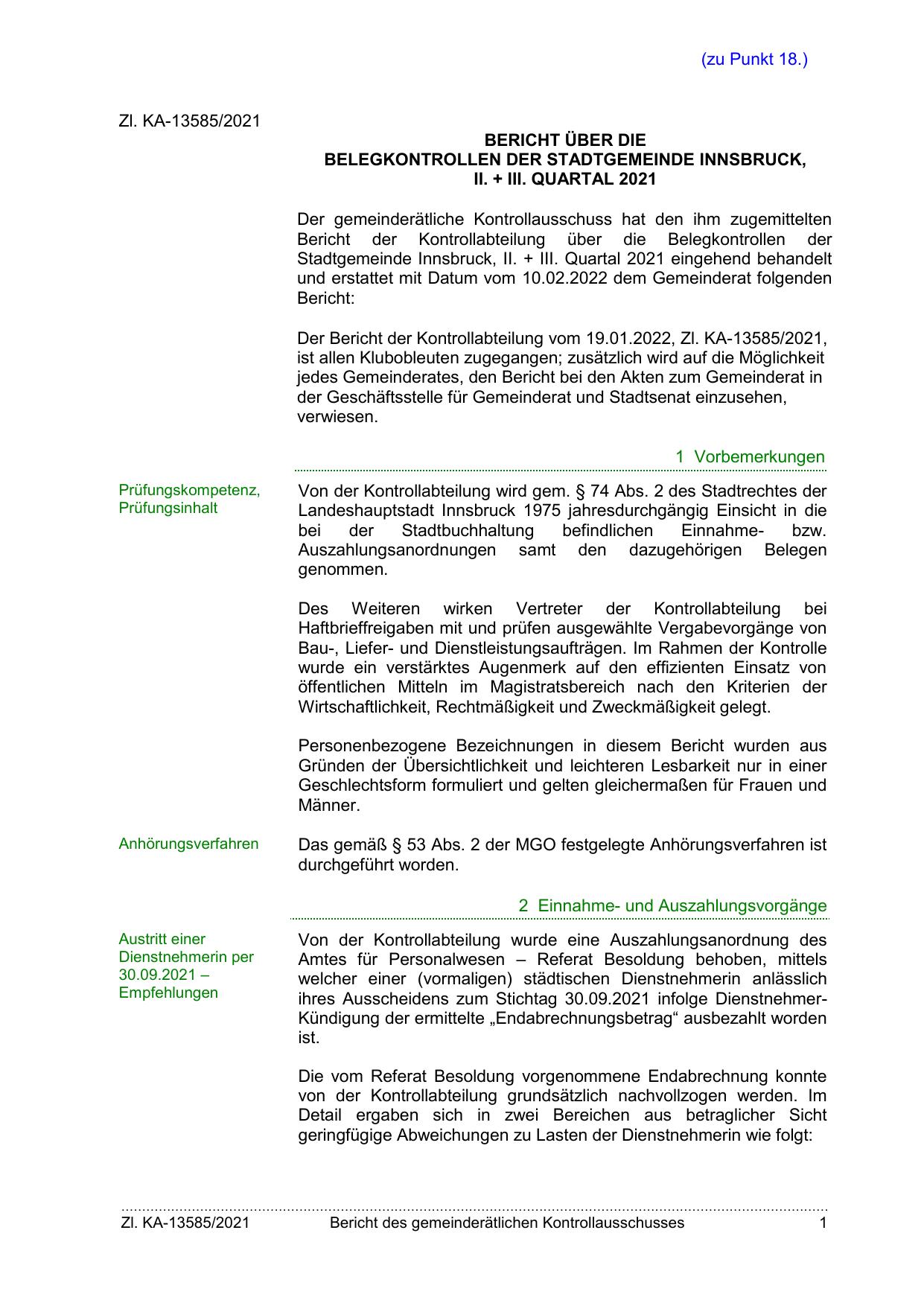 Stadtgemeinde Innsbruck, II. + III. Quartal 2021 eingehend behandelt