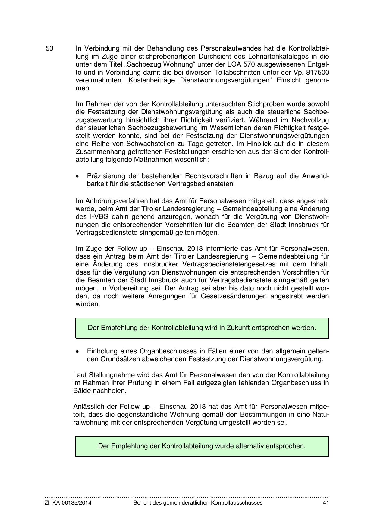 Anlässlich der Follow up – Einschau 2013 hat das Amt für Personalwesen mitgeteilt, dass die gegenständliche Wohnung gemäß den Bestimmungen in eine Naturalwohnung mit der entsprechenden Vergütung umgestellt worden sei.