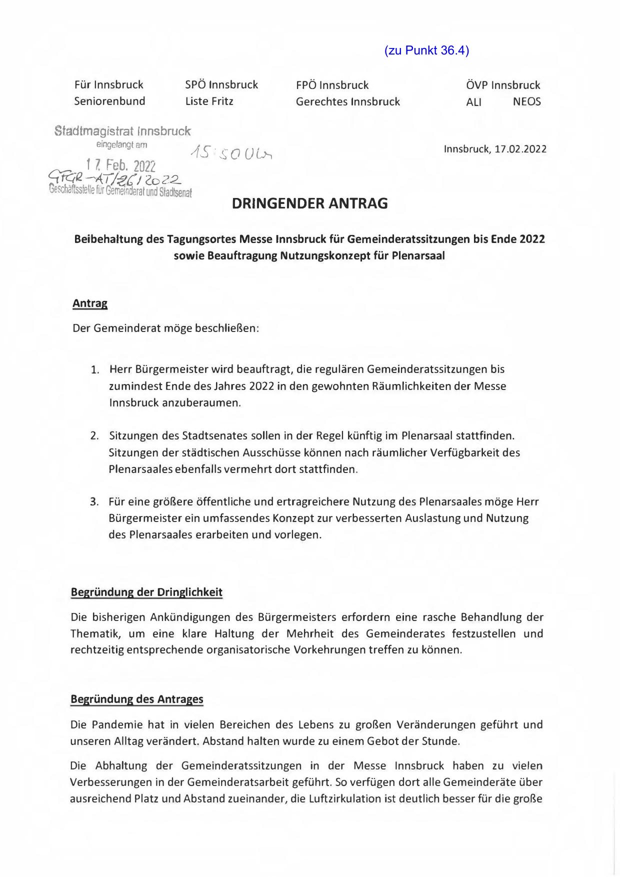 Beibehaltung des Tagungsortes Messe Innsbruck für Gemeinderatssitzungen bis Ende 2022