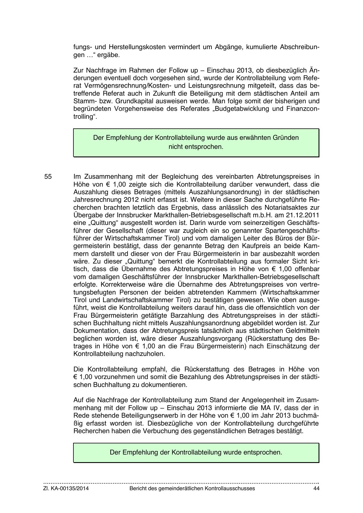 Zur Nachfrage im Rahmen der Follow up – Einschau 2013, ob diesbezüglich Änderungen eventuell doch vorgesehen sind, wurde der Kontrollabteilung vom Referat Vermögensrechnung/Kosten- und Leistungsrechnung mitgeteilt, dass das betreffende Referat auch in Zukunft die Beteiligung mit dem städtischen Anteil am