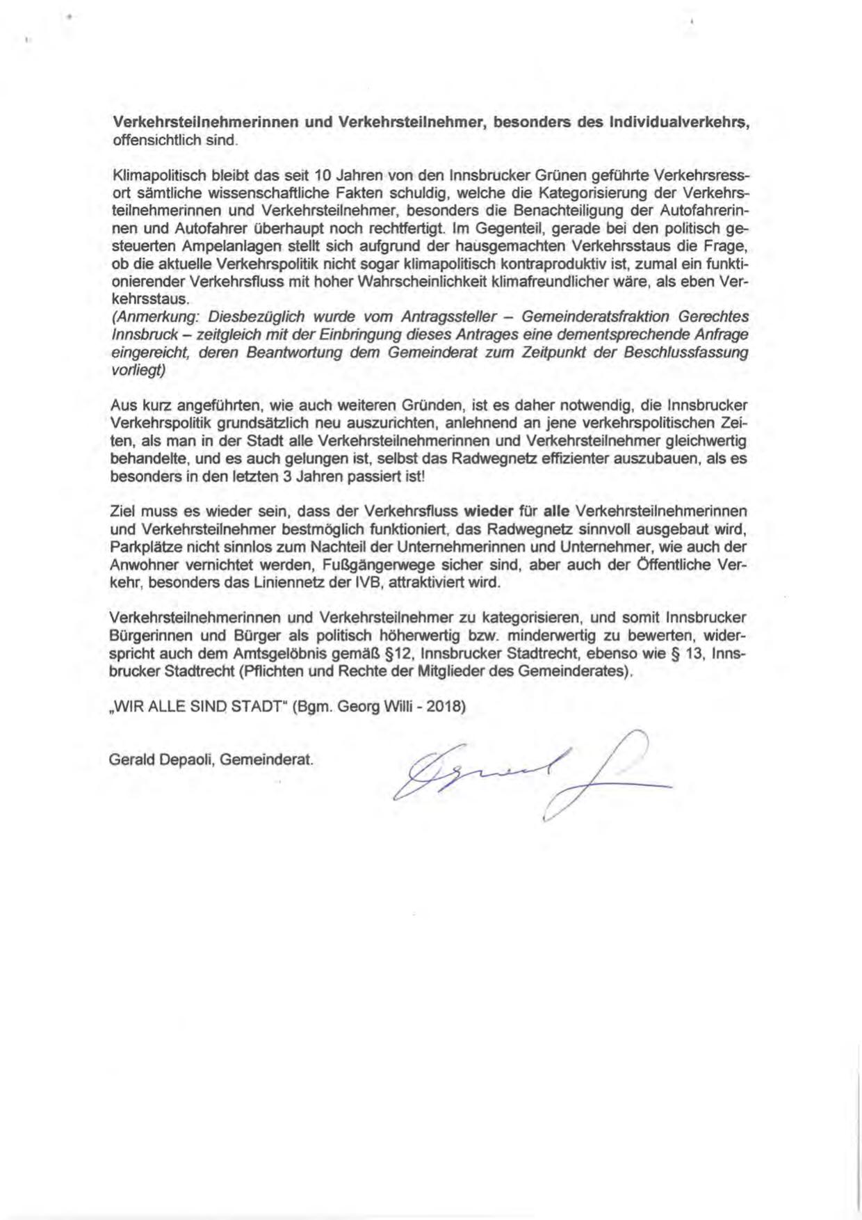 Klimapolitisch bleibt das seit 10 Jahren von den lnnsbrucker Grünen geführte Verkehrsressort sämtliche wissenschaftliche Fakten schuldig, welche die Kategorisierung der Verkehrsteilnehmerinnen und Verkehrsteilnehmer, besonders die Benachteiligung der Autofahrerinnen und Autofahrer überhaupt noch rechtfertigt. Im Gegenteil, gerade bei den politisch gesteuerten Ampelanlagen stellt sich aufgrund der hausgemachten Verkehrsstaus die Frage,