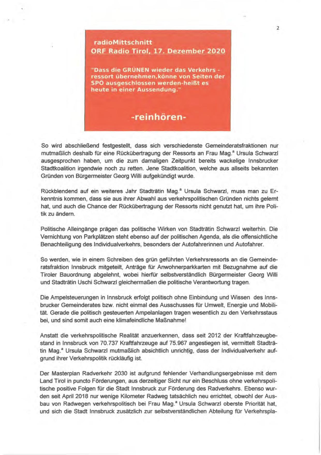 Anstatt die verkehrspolitische Realität anzuerkennen, dass seit 2012 der Kraftfahrzeugbestand in Innsbruck von 70.737 Kraftfahrzeuge auf 75.967 angestiegen ist, vermittelt Stadträtin Mag.a Ursula Schwarz! mutmaßlich absichtlich unrichtig, dass der Individualverkehr aufgrund ihrer Verkehrspolitik rückläufig ist.