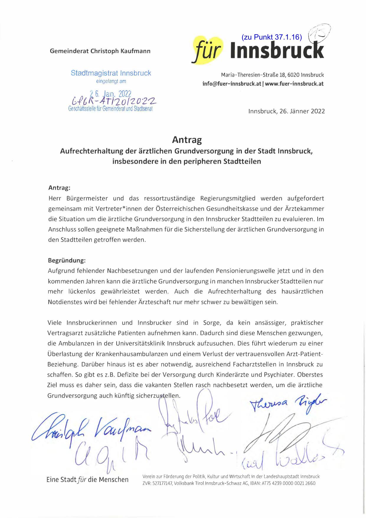 Aufrechterhaltung der ärztlichen Grundversorgung in der Stadt Innsbruck,