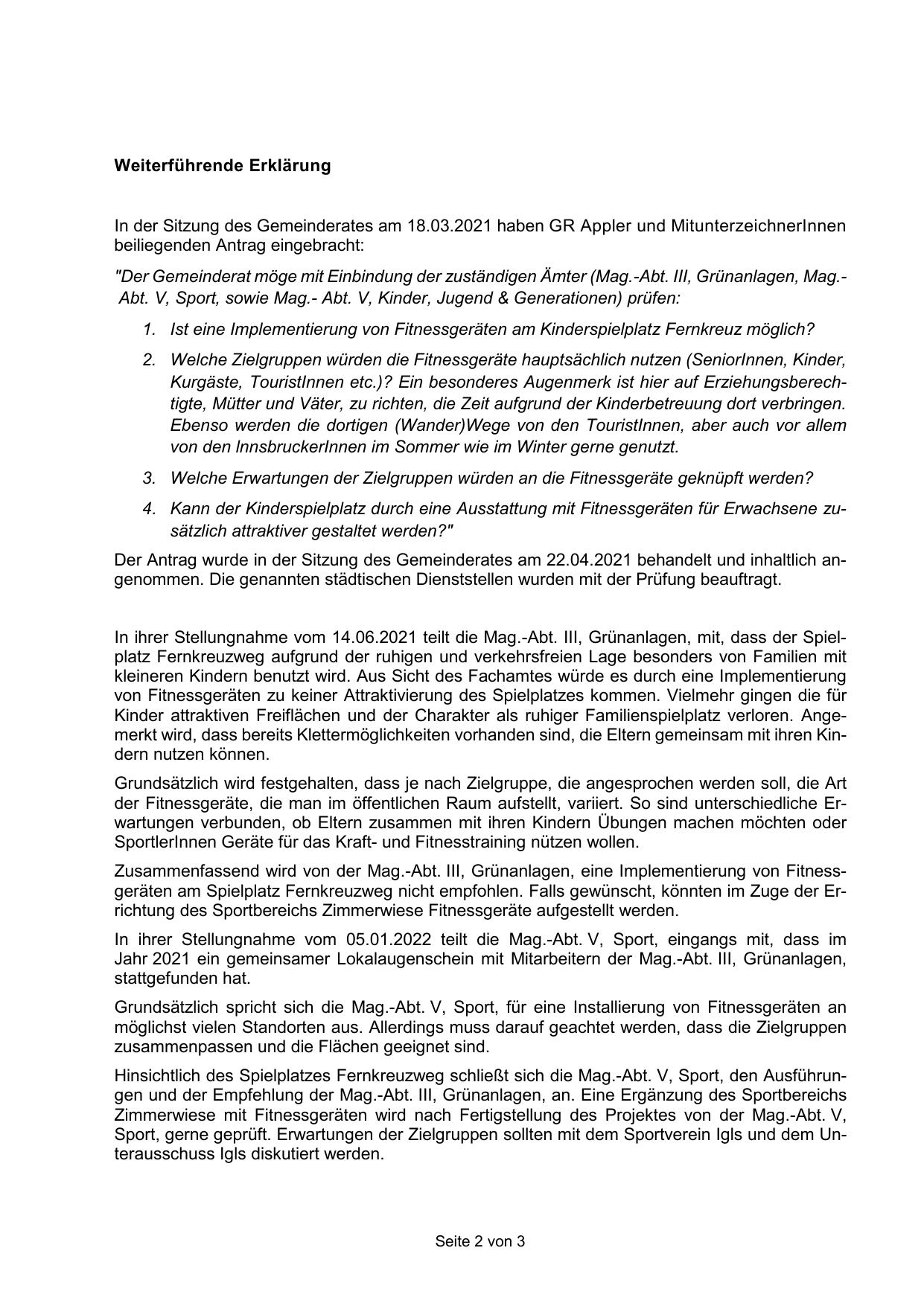 Zusammenfassend wird von der Mag.-Abt. III, Grünanlagen, eine Implementierung von Fitnessgeräten am Spielplatz Fernkreuzweg nicht empfohlen. Falls gewünscht, könnten im Zuge der Errichtung des Sportbereichs Zimmerwiese Fitnessgeräte aufgestellt werden.