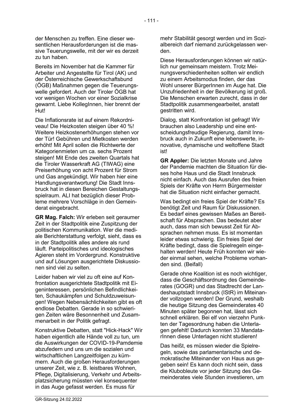 dass die Geschäftsordnung des Gemeinderates (GOGR) und das Stadtrecht der Landeshauptstadt Innsbruck (IStR) im Miteinander vollzogen werden! Der Grund, weshalb