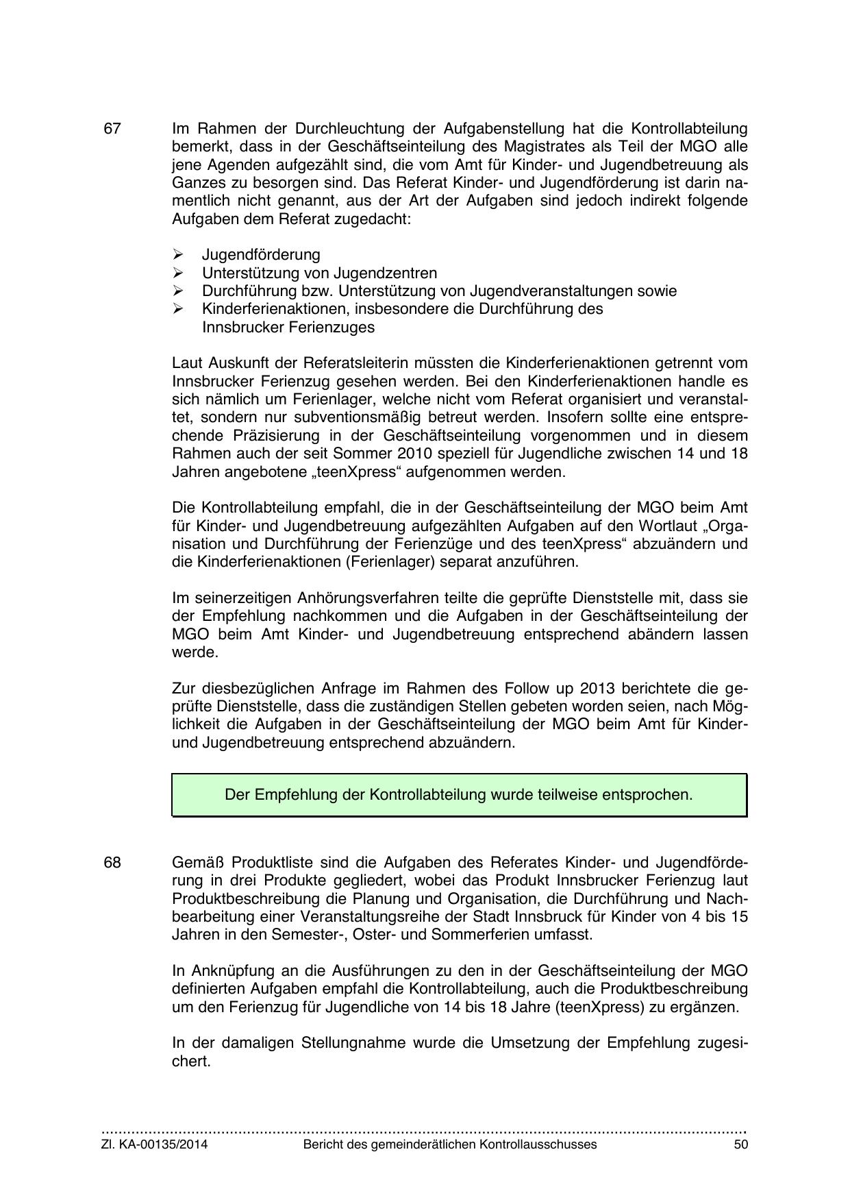 Zur diesbezüglichen Anfrage im Rahmen des Follow up 2013 berichtete die geprüfte Dienststelle, dass die zuständigen Stellen gebeten worden seien, nach Möglichkeit die Aufgaben in der Geschäftseinteilung der MGO beim Amt für Kinderund Jugendbetreuung entsprechend abzuändern.
