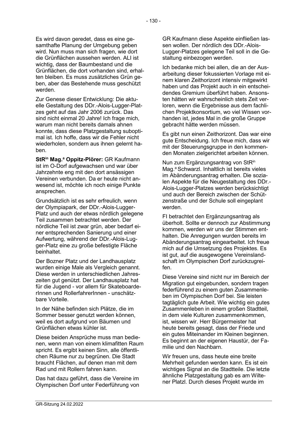 im Abänderungsantrag erhalten. Die sozialen Aspekte für die Neugestaltung des DDr.Alois-Lugger-Platzes werden berücksichtigt