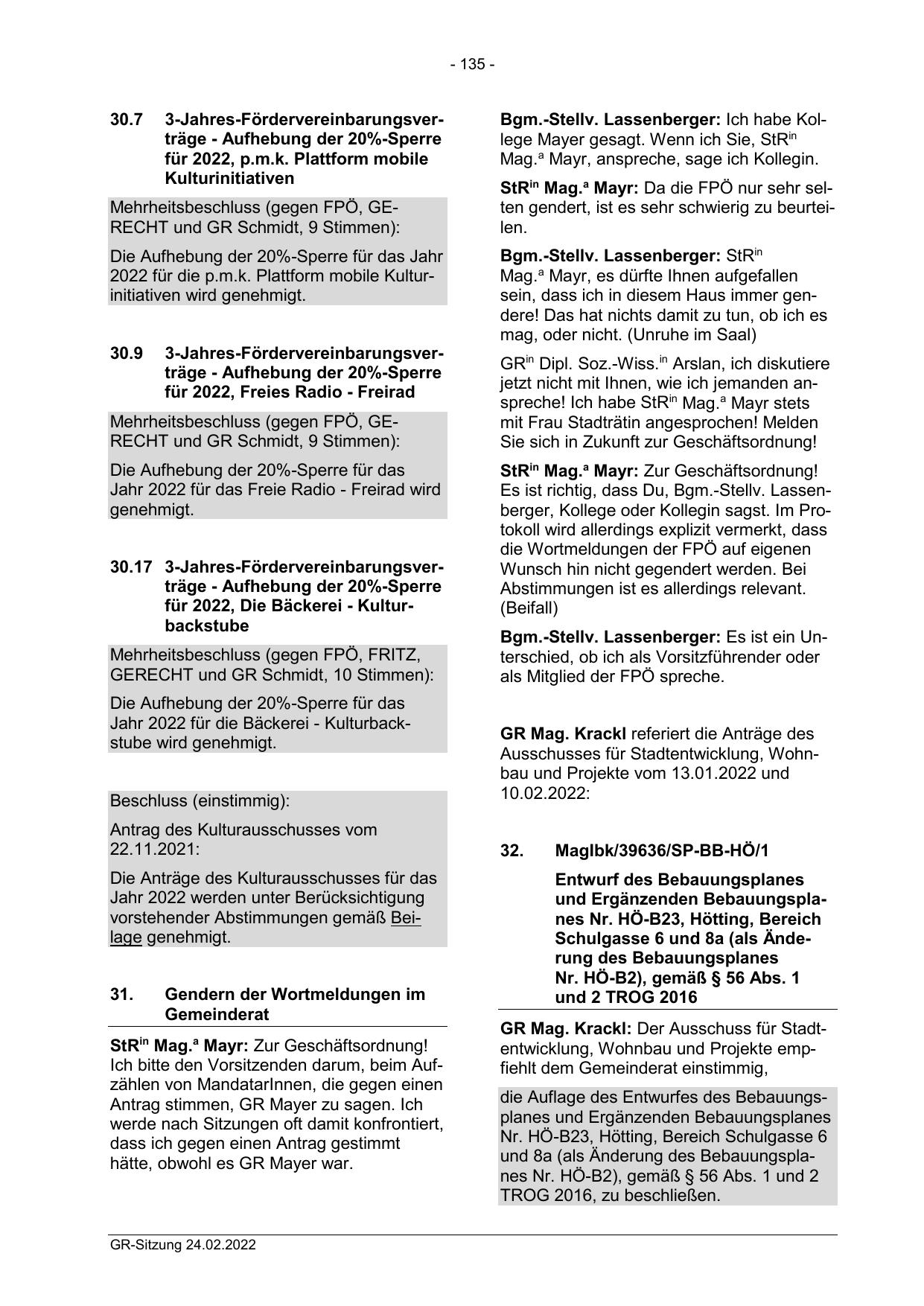 Es ist richtig, dass Du, Bgm.-Stellv. Lassenberger, Kollege oder Kollegin sagst. Im Protokoll wird allerdings explizit vermerkt, dass