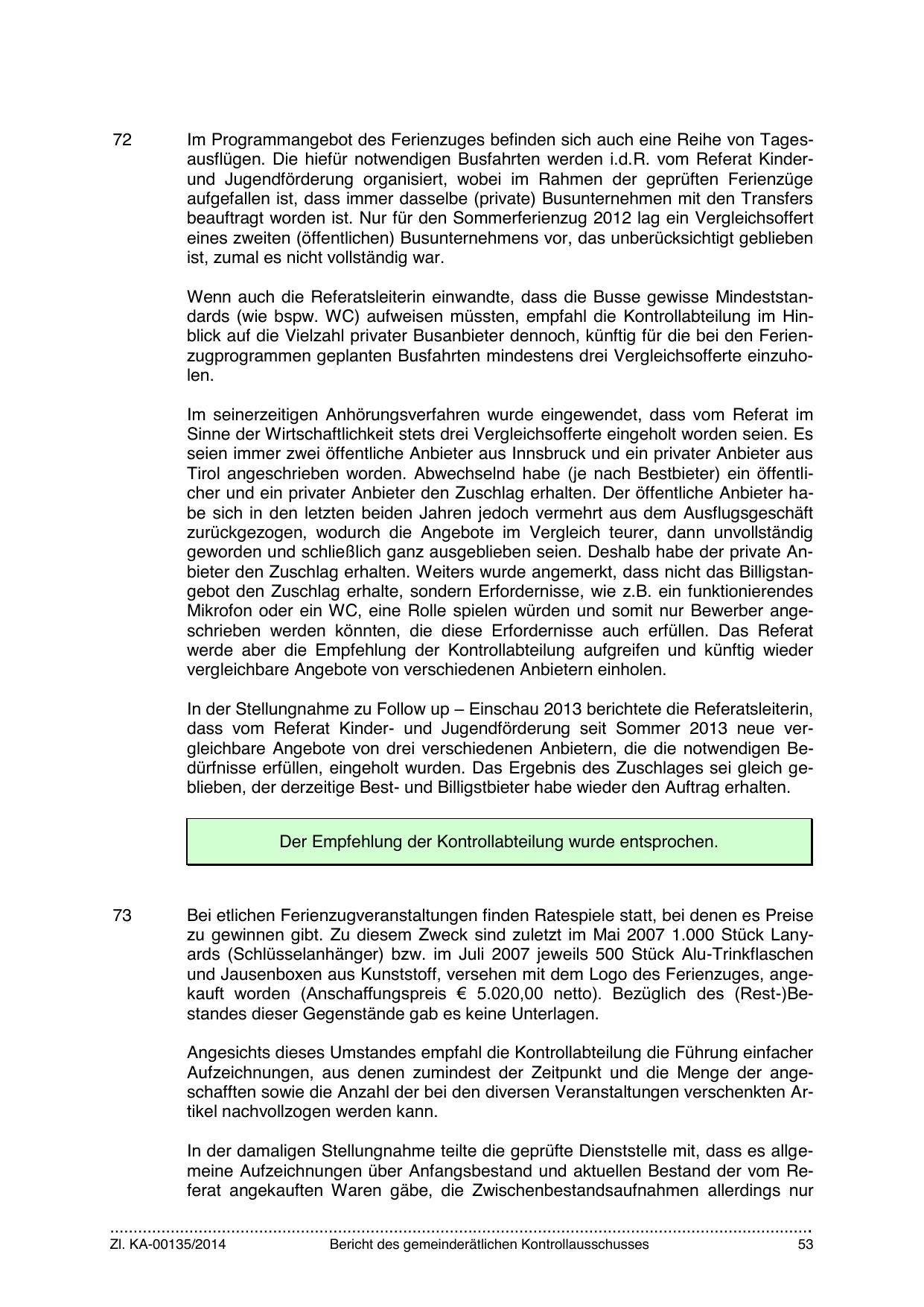 Wenn auch die Referatsleiterin einwandte, dass die Busse gewisse Mindeststandards (wie bspw. WC) aufweisen müssten, empfahl die Kontrollabteilung im Hinblick auf die Vielzahl privater Busanbieter dennoch, künftig für die bei den Ferienzugprogrammen geplanten Busfahrten mindestens drei Vergleichsofferte einzuholen.