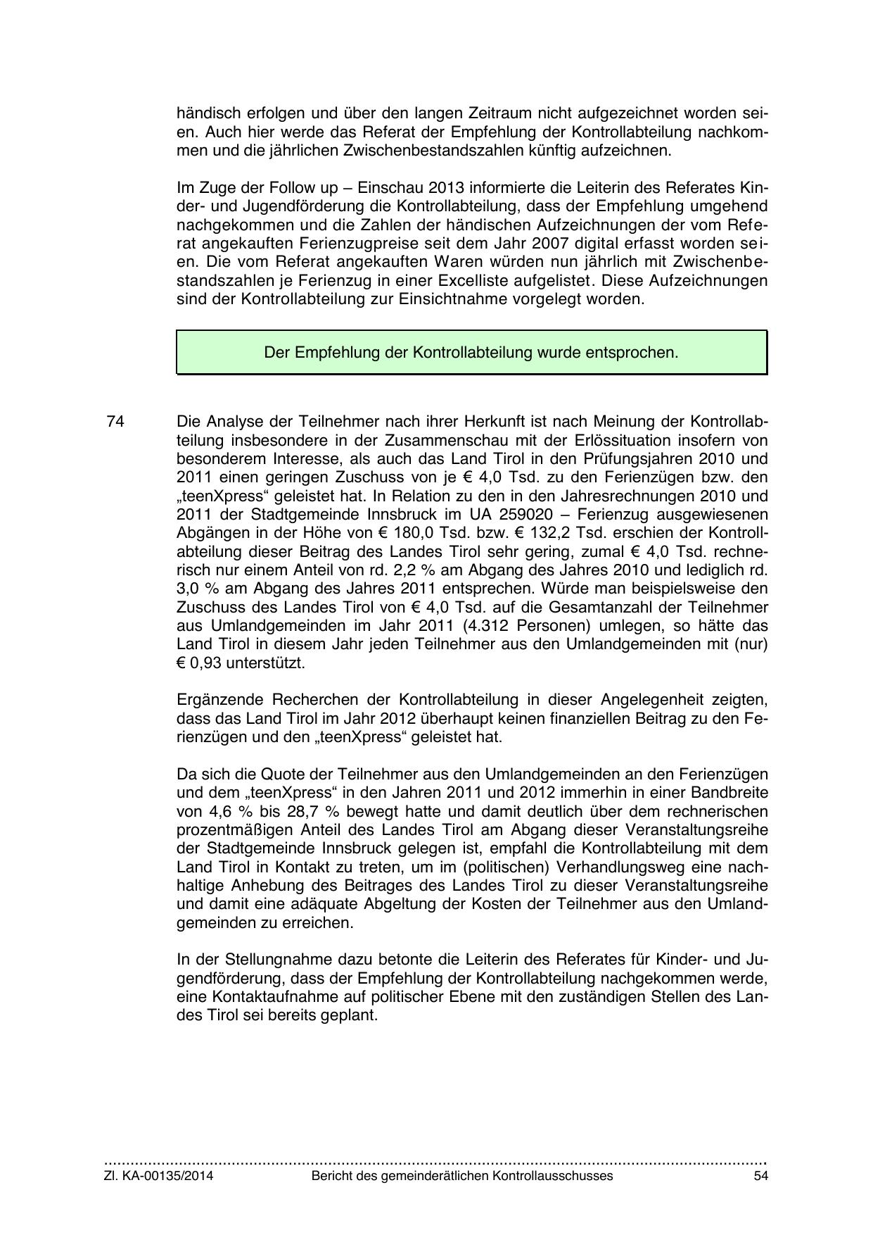 Im Zuge der Follow up – Einschau 2013 informierte die Leiterin des Referates Kinder- und Jugendförderung die Kontrollabteilung, dass der Empfehlung umgehend