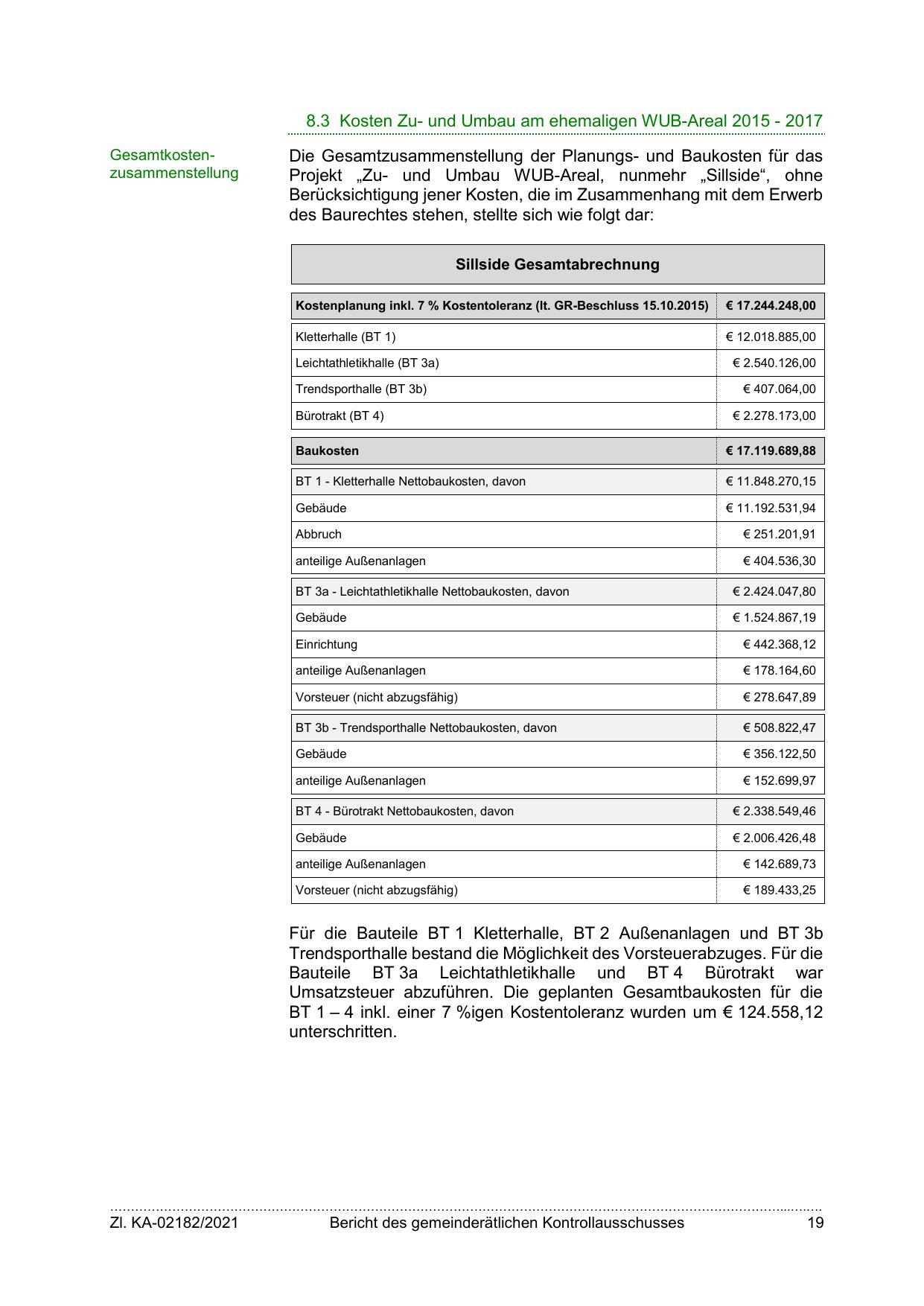8.3 Kosten Zu- und Umbau am ehemaligen WUB-Areal 2015 - 2017