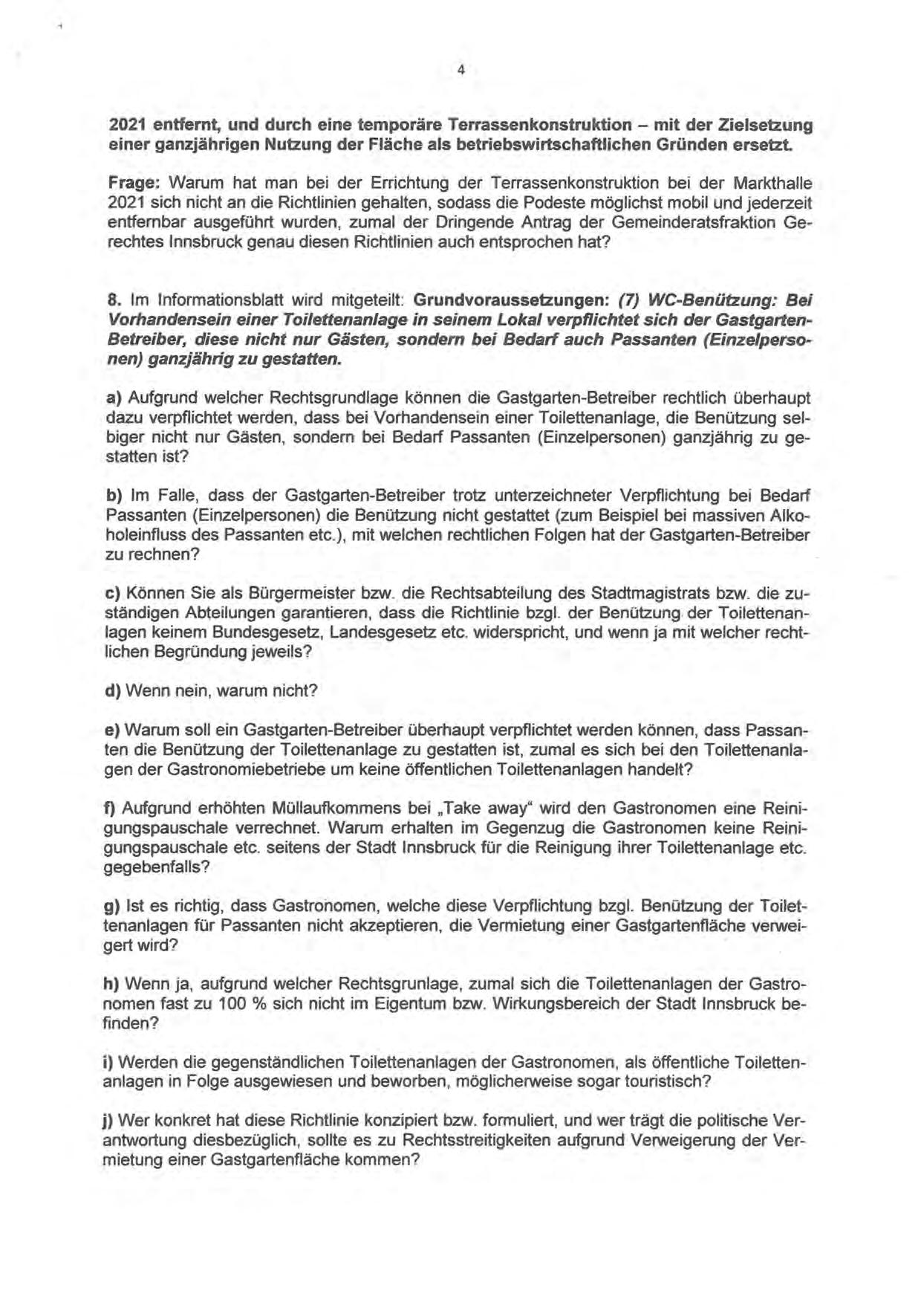 h) Wenn ja, aufgrund welcher Rechtsgrunlage, zumal sich die Toilettenanlagen der Gastronomen fast zu 100 % sich nicht im Eigentum bzw. Wirkungsbereich der Stadt Innsbruck befinden?