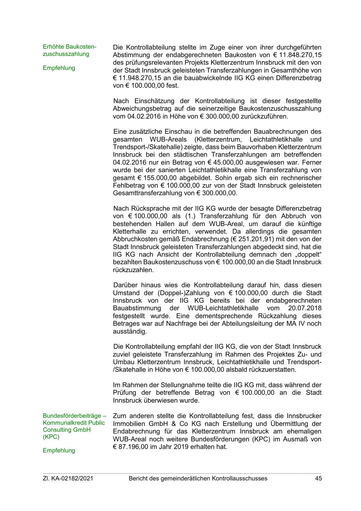 Die Kontrollabteilung empfahl der IIG KG, die von der Stadt Innsbruck