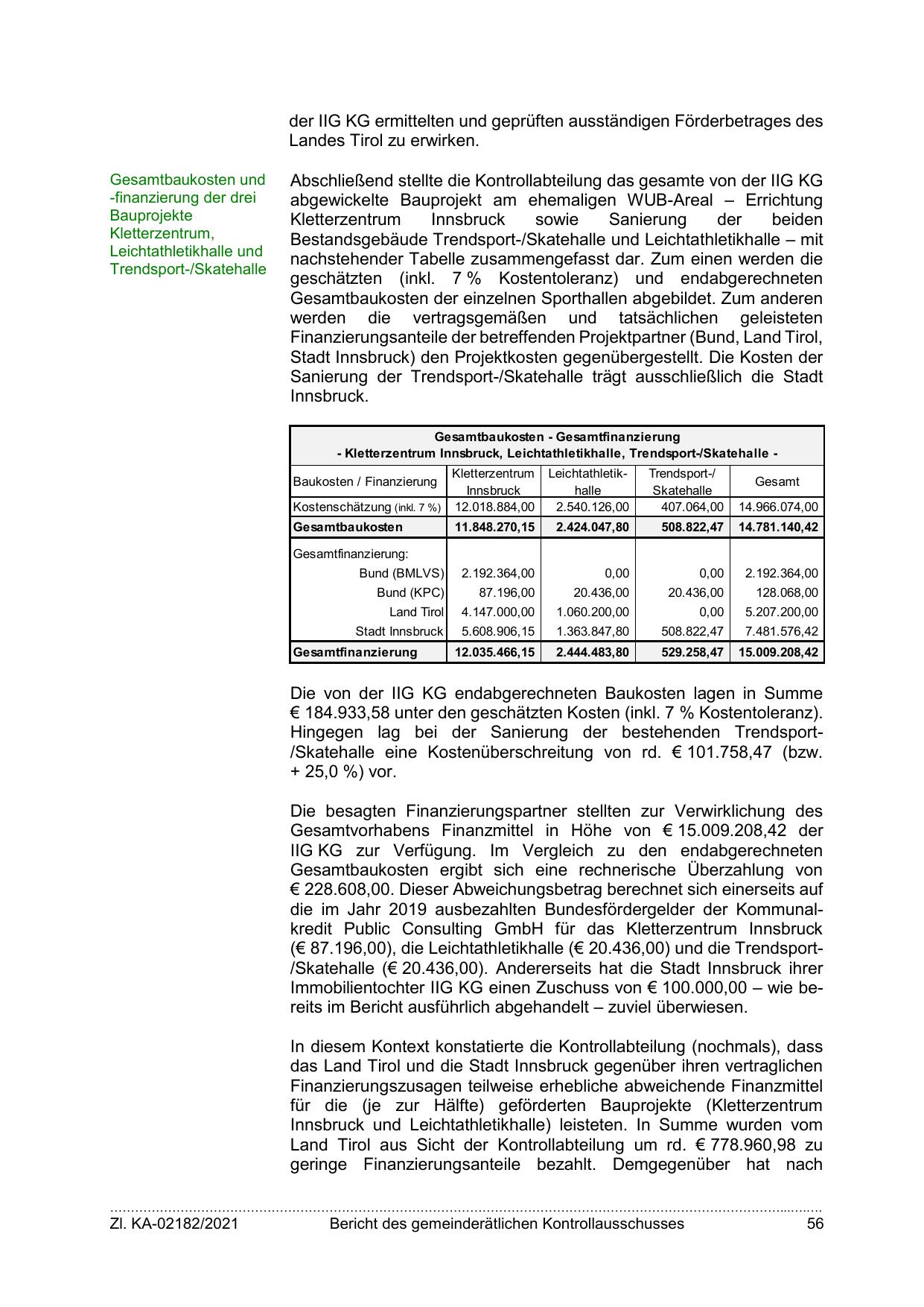 (€ 87.196,00), die Leichtathletikhalle (€ 20.436,00) und die Trendsport/Skatehalle (€ 20.436,00). Andererseits hat die Stadt Innsbruck ihrer