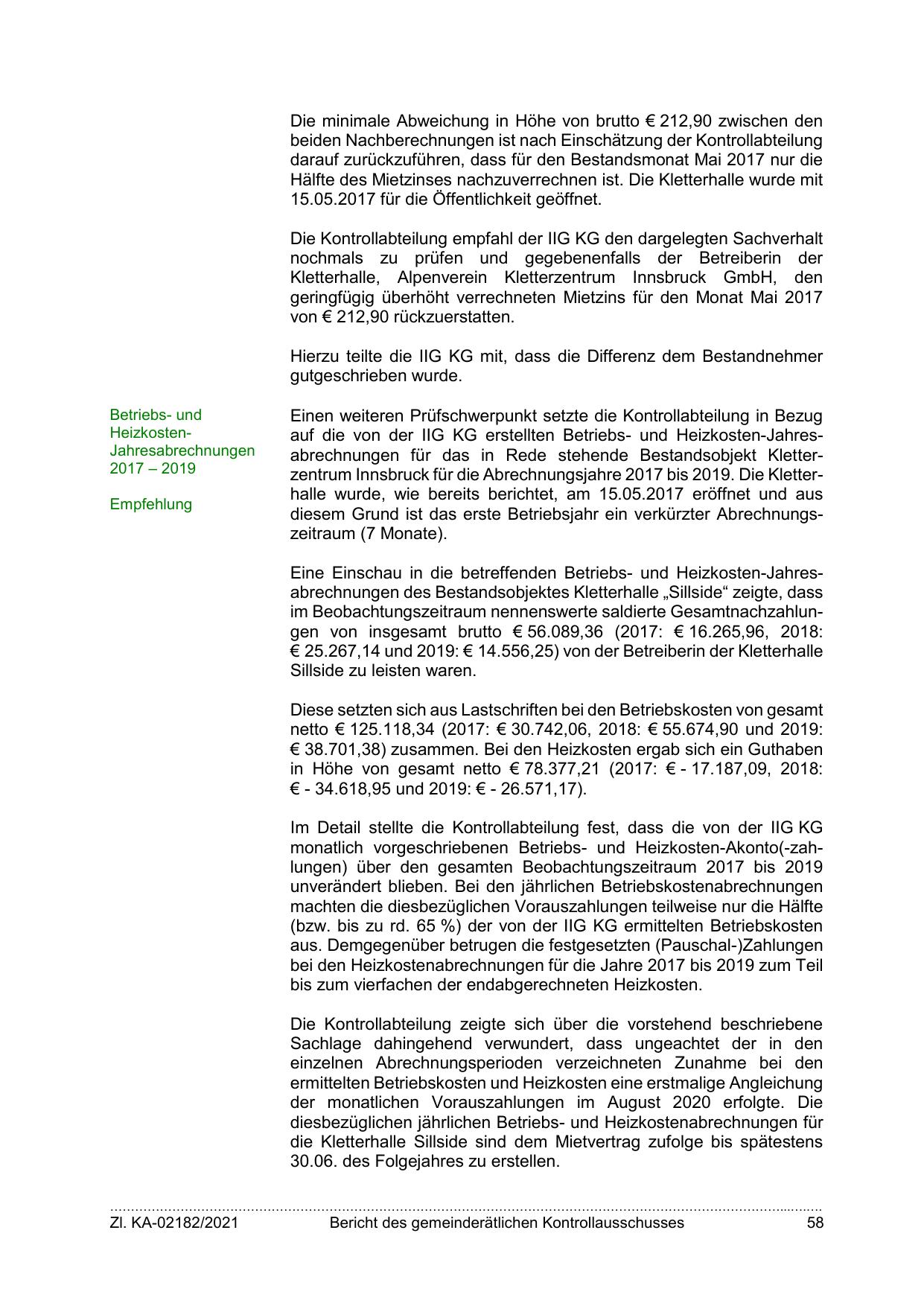 auf die von der IIG KG erstellten Betriebs- und Heizkosten-Jahresabrechnungen für das in Rede stehende Bestandsobjekt Kletterzentrum Innsbruck für die Abrechnungsjahre 2017 bis 2019. Die Kletterhalle wurde, wie bereits berichtet, am 15.05.2017 eröffnet und aus