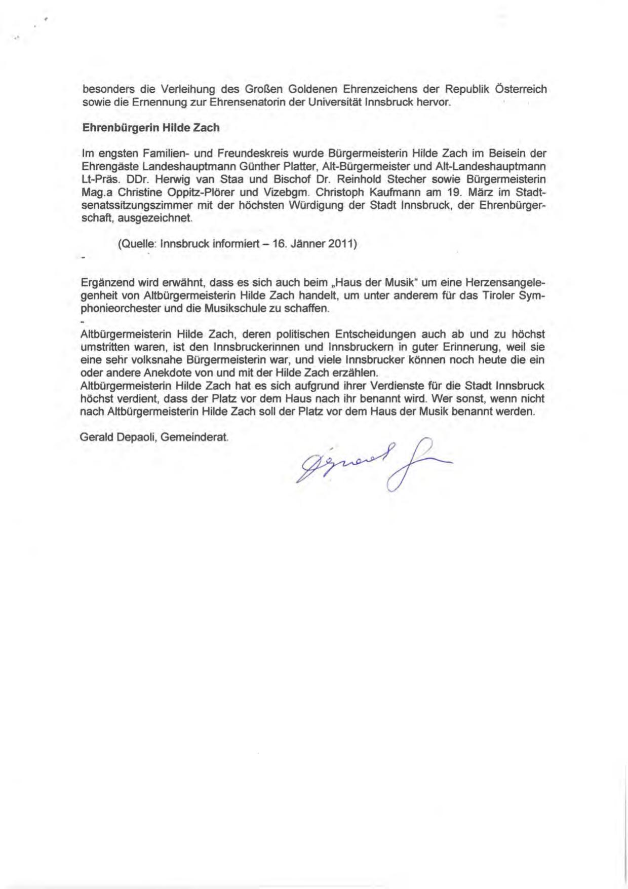 Ergänzend wird erwähnt, dass -es sich auch beim „Haus der Musik" um eine Herzensangelegenheit von Altbürgermeisterin Hilde Zach handelt, um unter anderem für das Tiroler Symphonieorchester und die Musikschule zu schaffen.