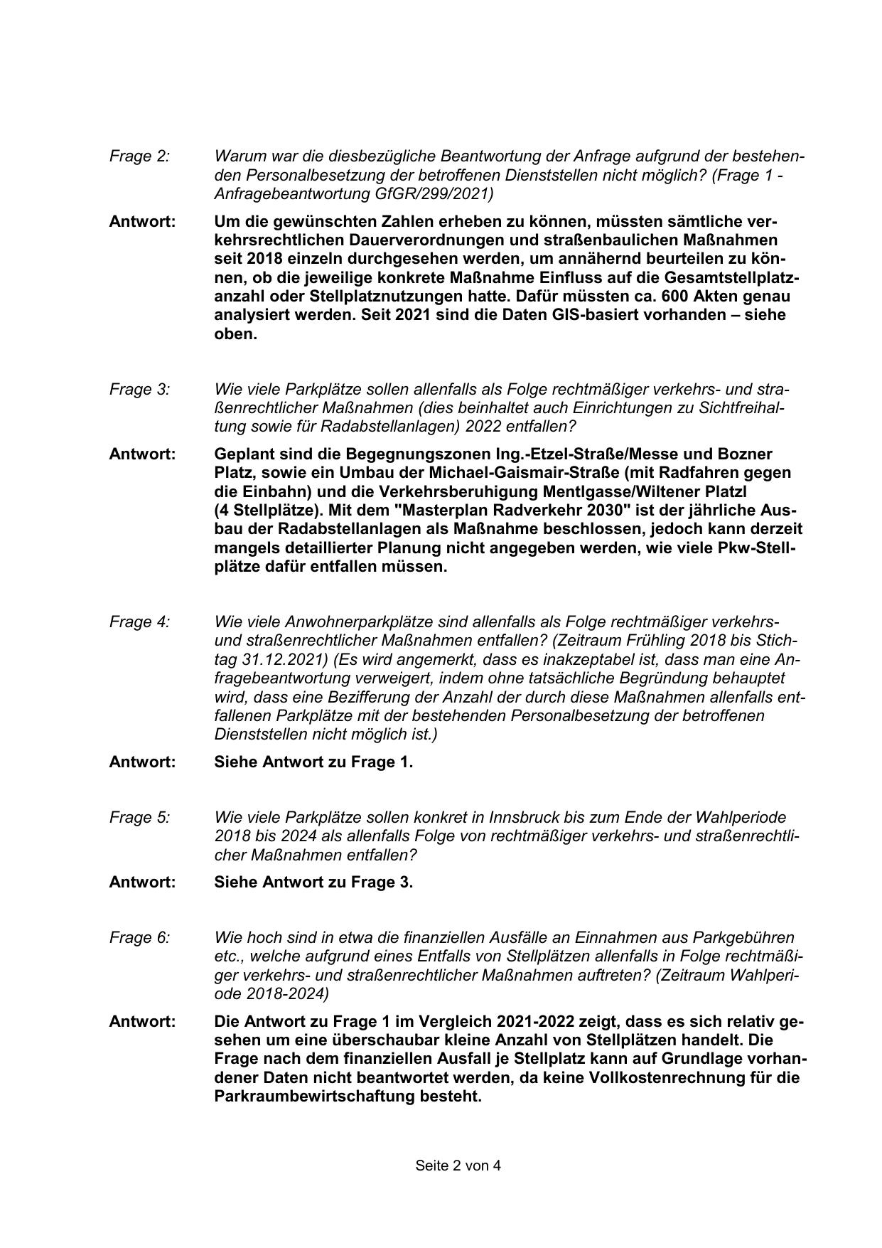Wie viele Anwohnerparkplätze sind allenfalls als Folge rechtmäßiger verkehrsund straßenrechtlicher Maßnahmen entfallen? (Zeitraum Frühling 2018 bis Stichtag 31.12.2021) (Es wird angemerkt, dass es inakzeptabel ist, dass man eine Anfragebeantwortung verweigert, indem ohne tatsächliche Begründung behauptet