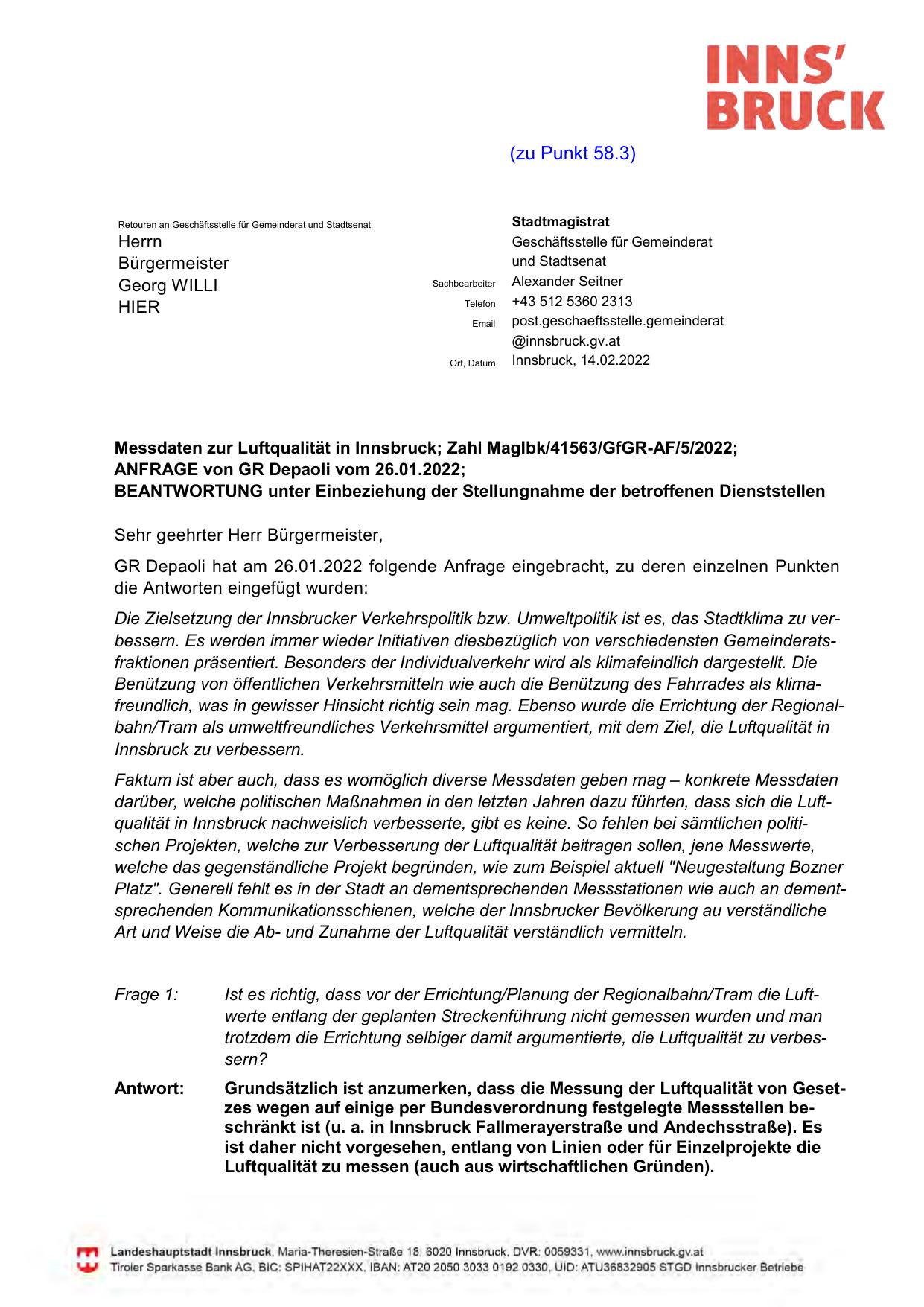 Messdaten zur Luftqualität in Innsbruck; Zahl MagIbk/41563/GfGR-AF/5/2022;